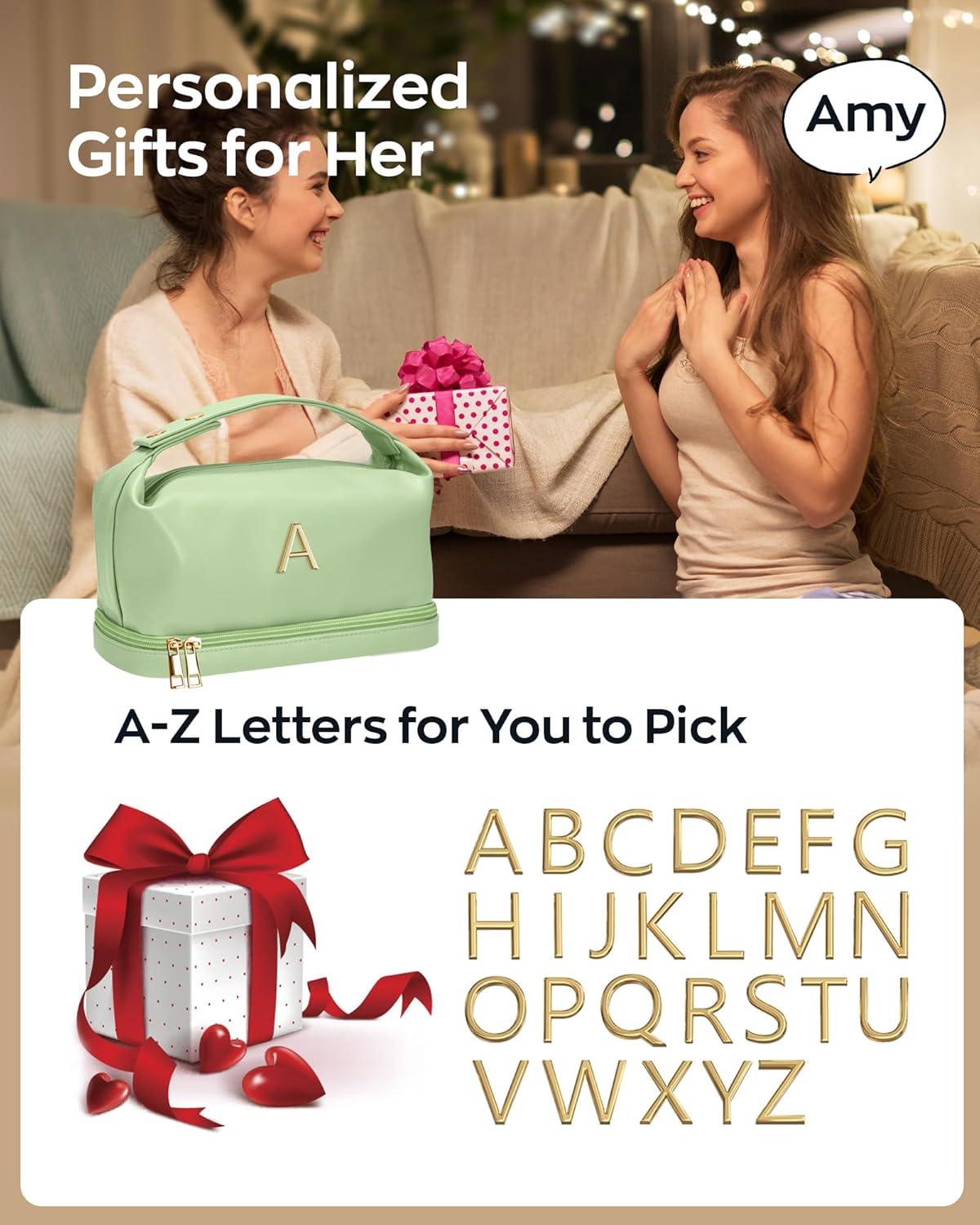 - 【Double-layer Design】The monogrammed makeup bags is double-layer with a unique design of upper and lower storage areas. The bottom compartment is great for storing cosmetics, eye shadows, makeup brushes, and other items. The top layer features a large opening for easy access, along with two small compartments for lipsticks and earrings.