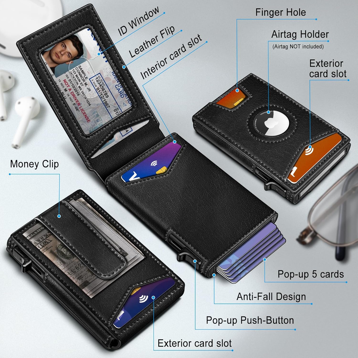 - AMPLE STORAGE--Easy for 9 cards and holds Airtag,Slim wallet with refined layout to fit in front pocket,the money clip with Leather wrapped for carry cash,5 cards in the aluminum case with pop-up access,4 cards in the leather shell;