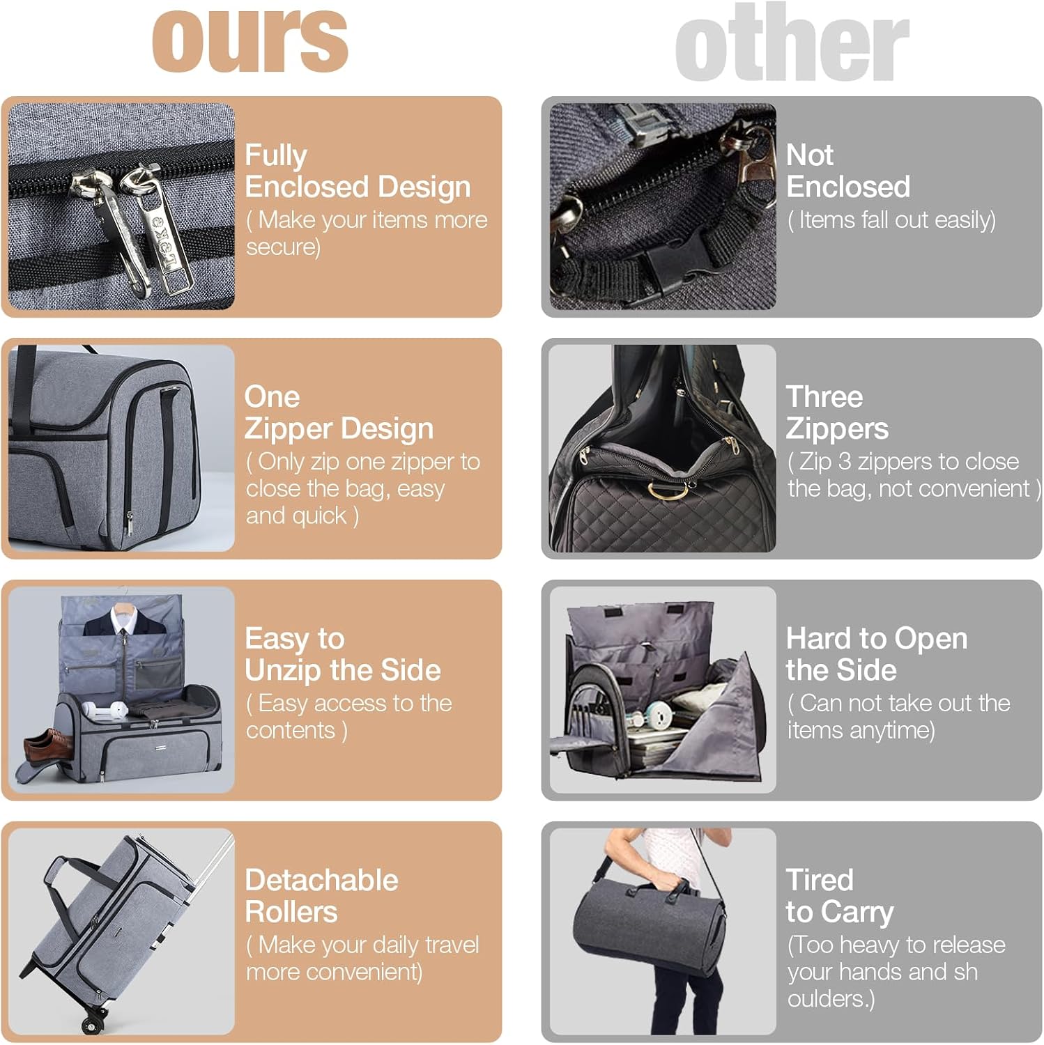 - Versatile Garment Duffel Bag: Our rolling garment bag is designed with the features of a garment bag and a duffel bag, can be used as a hanging garment bag or travel luggage bag, while keeping your suits or dresses wrinkle-free, clean and tidy