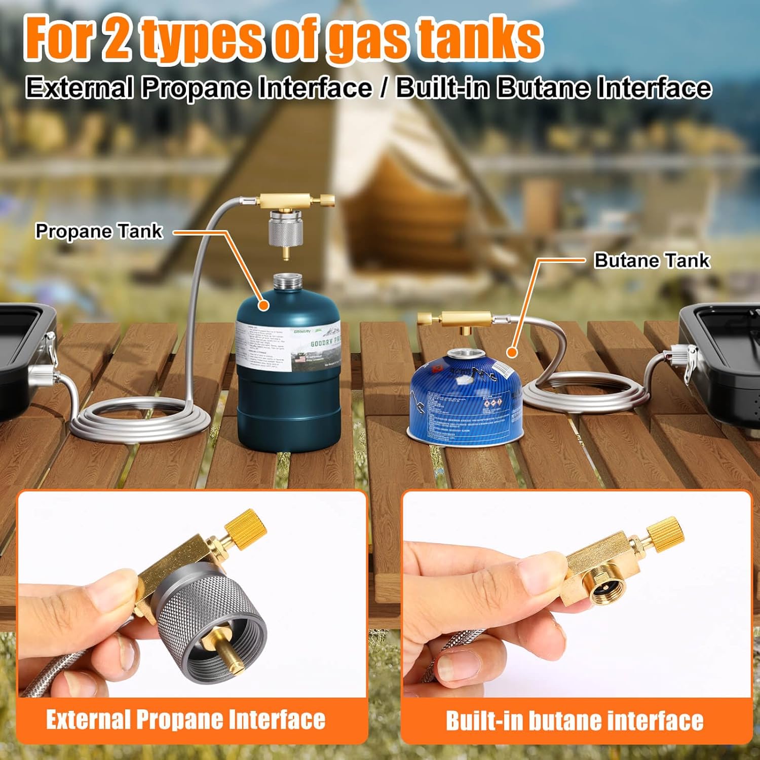 - 【All-in-One Cooking Kit with Carry Bag】Includes a protable cookware set: frying pan, pot, kettle and a griddle, plus adapters for isobutane, and propane. The carry bag features dedicated slots for gas tanks on both sides, keeping your gear organized. This portable propane camp stove makes setup, transport, and cooking effortless.Pack smart, cook anywhere.