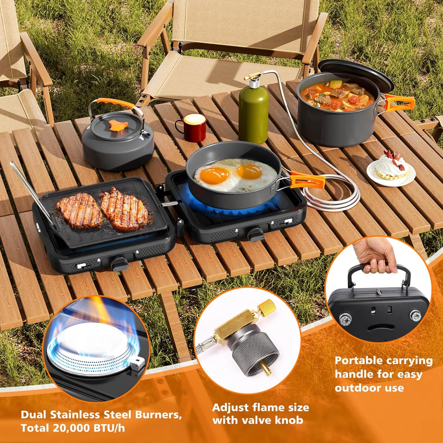 - 【20,000 BTU Dual Burners with Flexible Use】Featuring two 10,000 BTU burners, this 2 burner propane camping stove supports simultaneous cooking with pans up to 10". Boil water, grill meat, or sauté veggies at the same time with full heat control on each side.Cook more meals, save more time at camp.