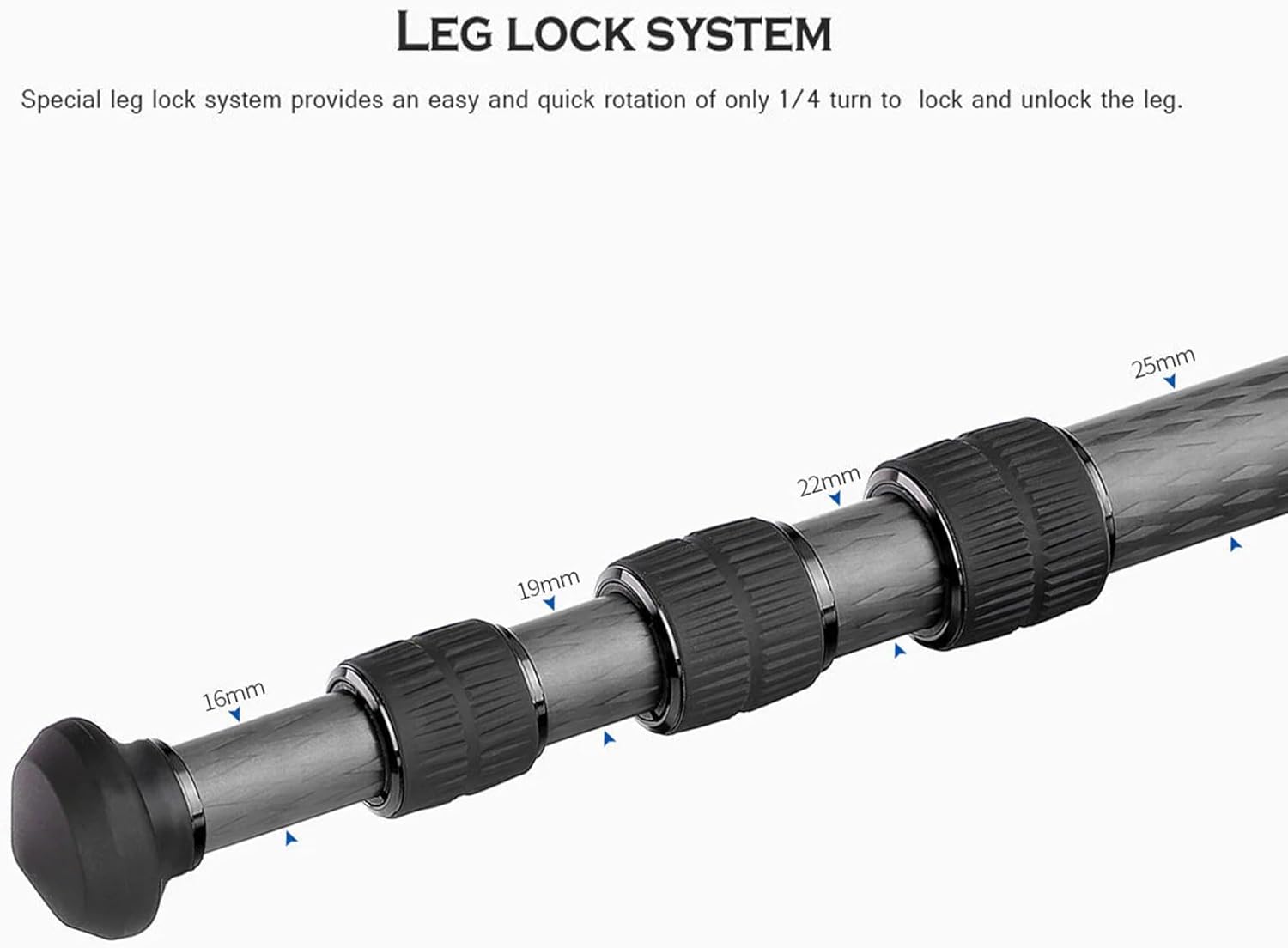 - Versatile Carbon Fiber Tripod: Our leofoto carbon fiber camera tripod features a telescopic design. This lightweight monopod is the perfect travel companion, weighing only 2.03 lbs yet supporting up to 17.64 lbs