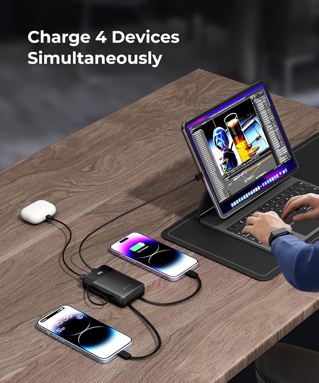 - 【Four Devices, One Charge】With 30000mAh capacity, our banks can offer 5.5 charges for the iPhone 15, 4.6 charges for the Samsung S24, and 2.7 charges for the iPad Pro. Charge 4 devices max at once, it's a must in accessories for a power outage, hurricane preparedness, and emergency. Perfect for a cruise ship travel/road trip/car journey/hiking/camping/summer day at the beach/college dorm room