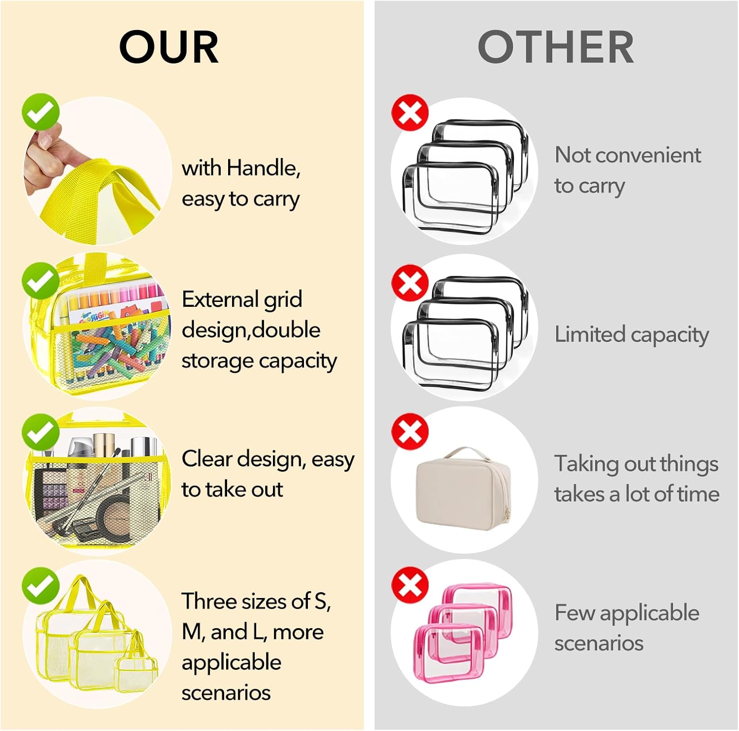 XEWEA Clear Travel Toiletry Bags, 3 Pack TSA Approved Transparent Makeup Bag for Men Women,Large Waterproof PVC Quart Organizer Kit with Zipper for Toiletries Airline Essential,Toy Pouch Yellow