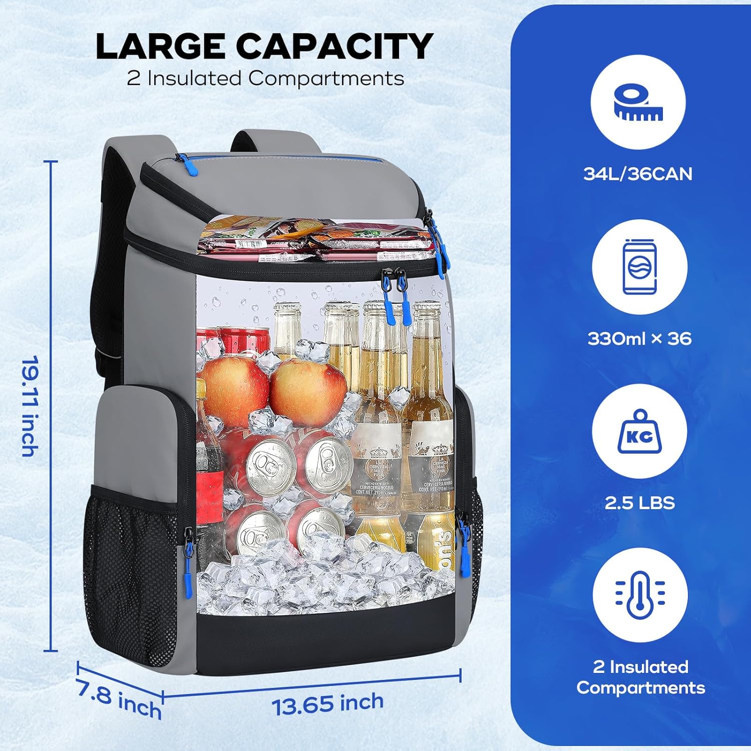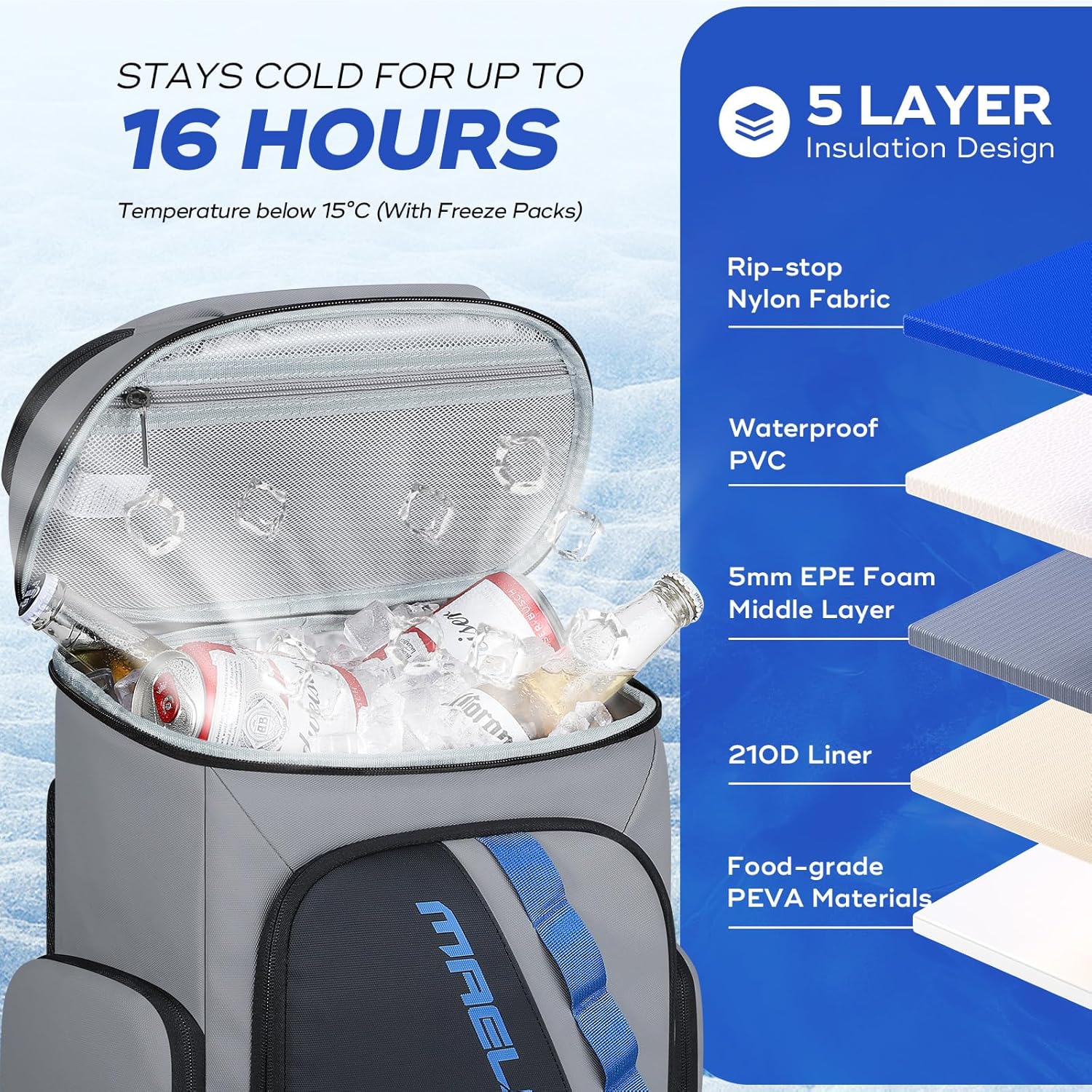 Maelstrom Backpack Cooler,36 Can Cooler Backpack,Soft Cooler Bag Insulated Leakproof,Lightweight Ice Chest Backpack,Travel Cooler Lunch Backpack for Camping,Hiking,Beach,Gray