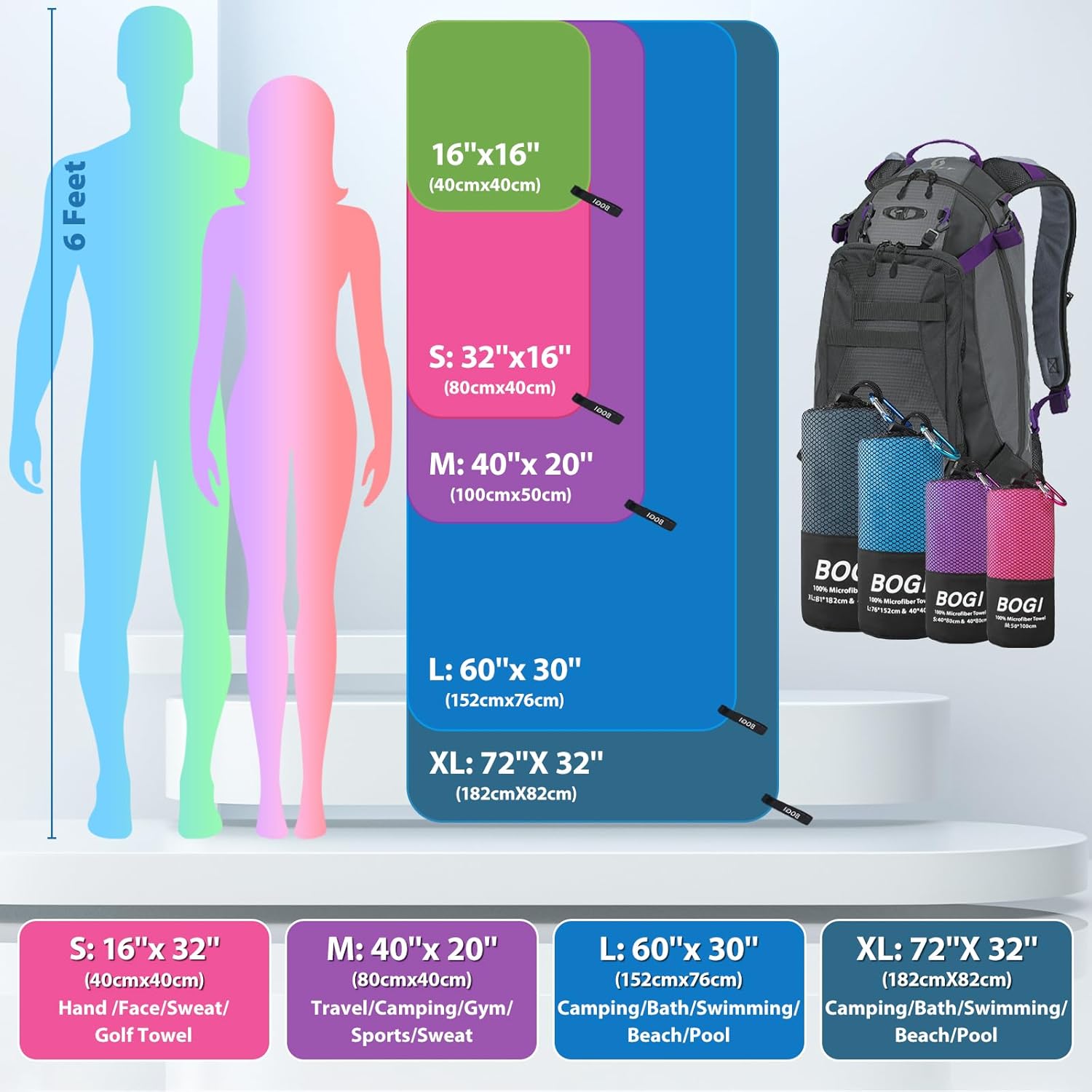 - 4 Sizes & Multi Use: BOGI microfiber towel set has 4 sizes in 6 colors. S: 16"x32" (2Pcs) is suitable for daily use, right size for your face, neck or hands to wipe the sweat off. M: 40"x20", best for backpacking, travel, camping, swimming, yoga, gym. L: 60"x30"+16"x16", good as a bath towel, microfiber towel for body or as a cape, blanket to keep warm, cover your deck chair. XL: 72"x32"+16"x16", an excellent pack towel for beach blanket, picnic mat, wall blanket or fashion as a tablecloth.