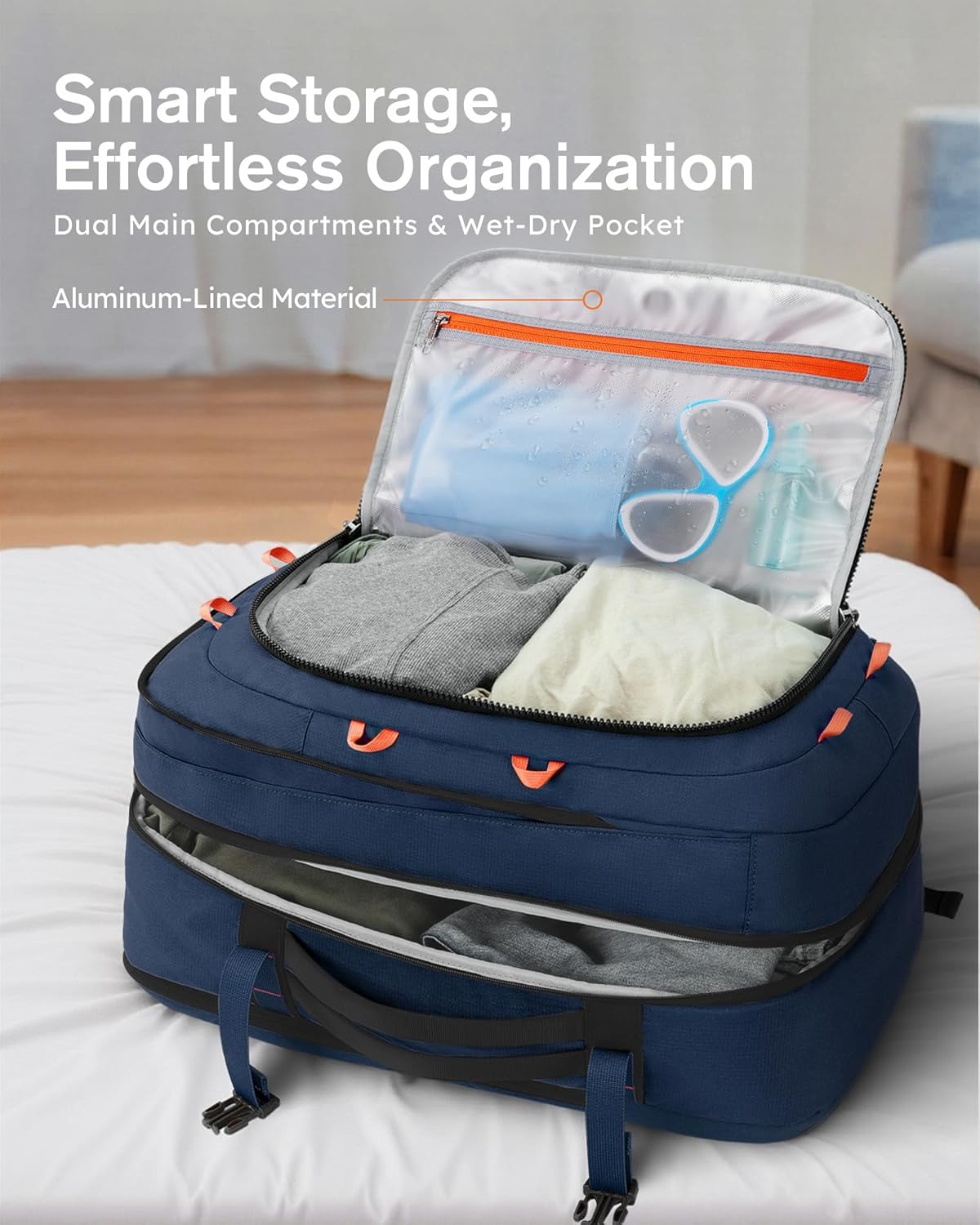 - 【Keep Dry & Organized – Separate Wet & Dry Storage】No more messy packing! This travel backpack features two waterproof dry-wet compartments made of premium aluminum film, keeping wet clothes, swimsuits, or toiletries away from your clean gear. Whether it's a weekend getaway or an outdoor adventure, stay organized and travel stress-free!