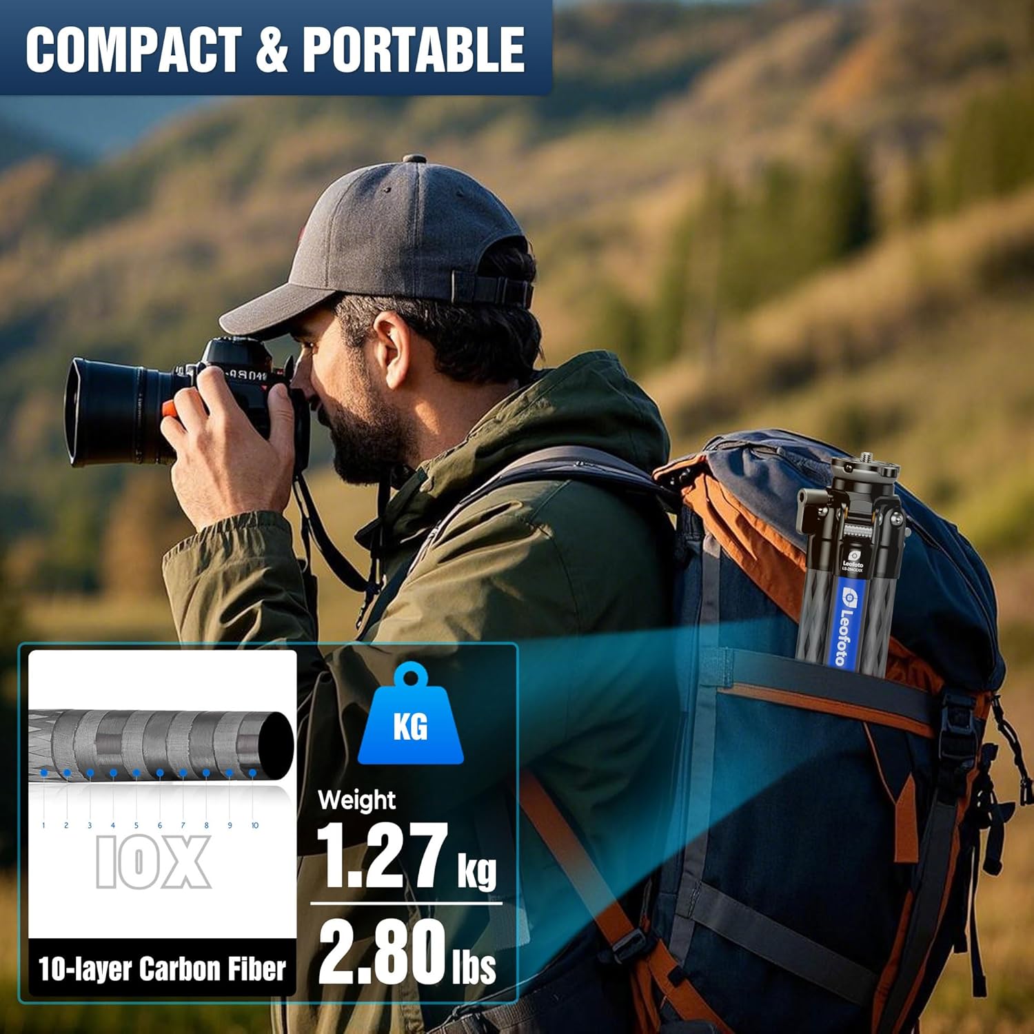 LEOFOTO LS-284CEXX Carbon Fiber Tripod with Leveling Base for Camera, 360° Portable Tripod with 3/8" Screw for Sport Camera/Phone Holder/Projector, A Bubble Level, Folded Length 21.06", Max Load 22LB