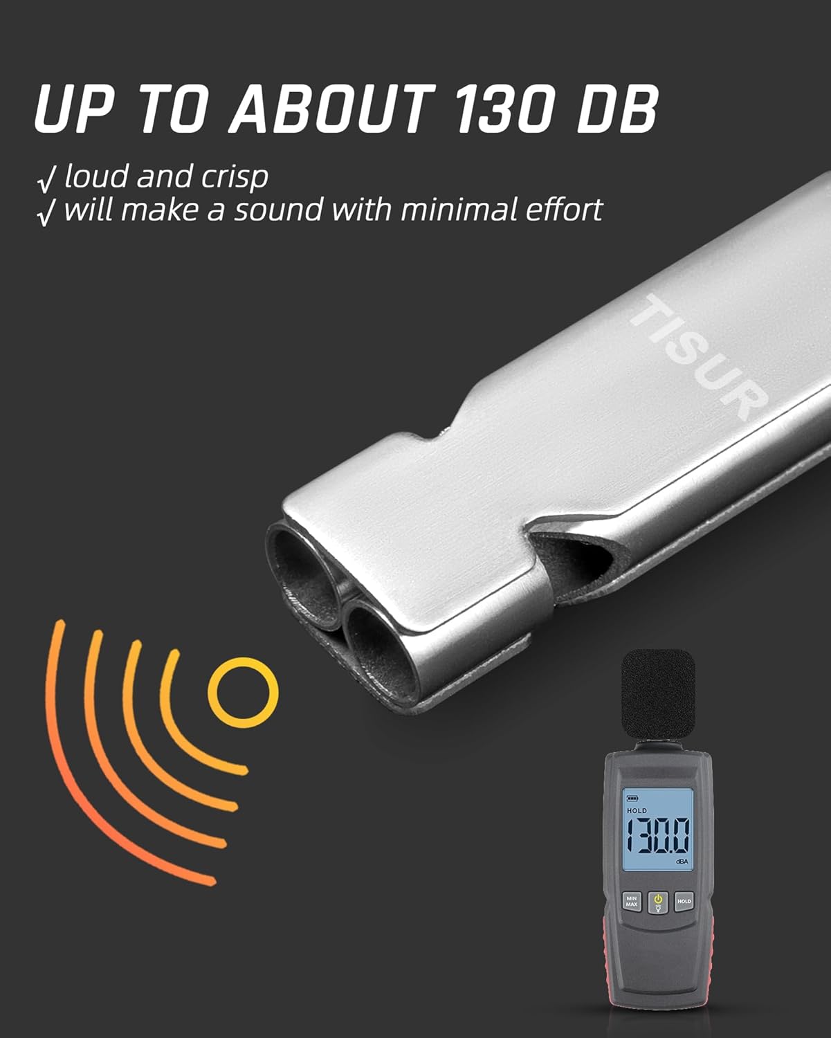 - High Quality Survival Whistles : Unique two-sound-chamber design of emergency whistle requires your light blow and then produces loud attention-grabbing sound up to about 130db, enough to call for help from a long distance and work great as signal whistle.