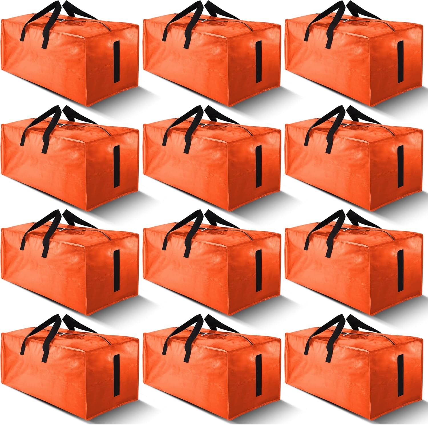 12 Pack Large Strong Moving Bags with Zippers & Carrying Handles - Water-Resistant - Heavy Duty Storage Tote for Space Saving, Fold Flat, Alternative to Moving Box (Orange)