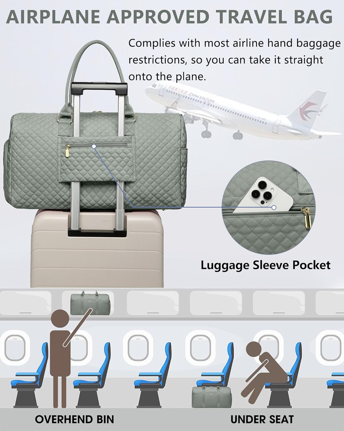 - AIRPLANE APPROVED TRAVEL BAG WITH SHOE COMPARTMENT - In the right side of the overnight bags, a separate shoe compartment can help you carry your shoes better. Carry on bag have 2 ventilation holes that disperses bad odors. Luggage strap on the back of the weekender travel bag can be inserted and secured to the handle of the luggage, freeing your hands on a trip. One zippered pocket on the back to hold your phone, passport. Duffle bag fits perfectly in the overhead bin and under the seat.