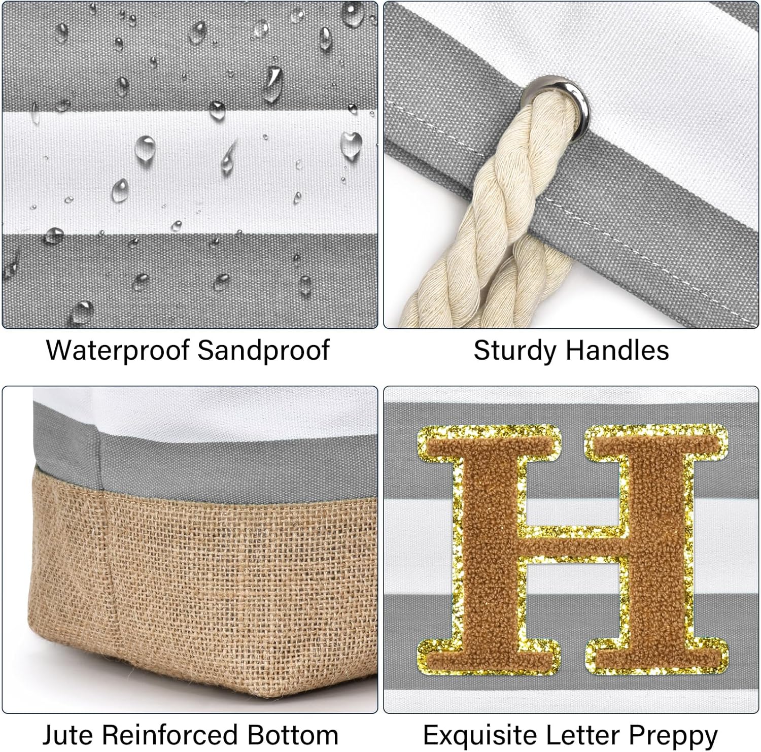 - Stylish & Unique Design: Adorned with a chic, stitched chenille letter edged in gold, the canvas tote bag is both stylish and unique. The letter symbolizes your individuality, while the classic stripe pattern and reinforced jute bottom add a touch of sophistication, making it suitable for any occasion