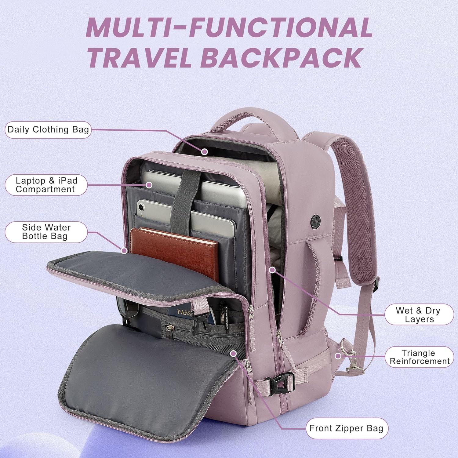 Travel Backpack, Carry on Flight Approved Backpack with Multi-Pockets, TSA Waterproof 17.3inch Laptop Backpack, Personal Item Travel Bag for Men Women, Light Purple