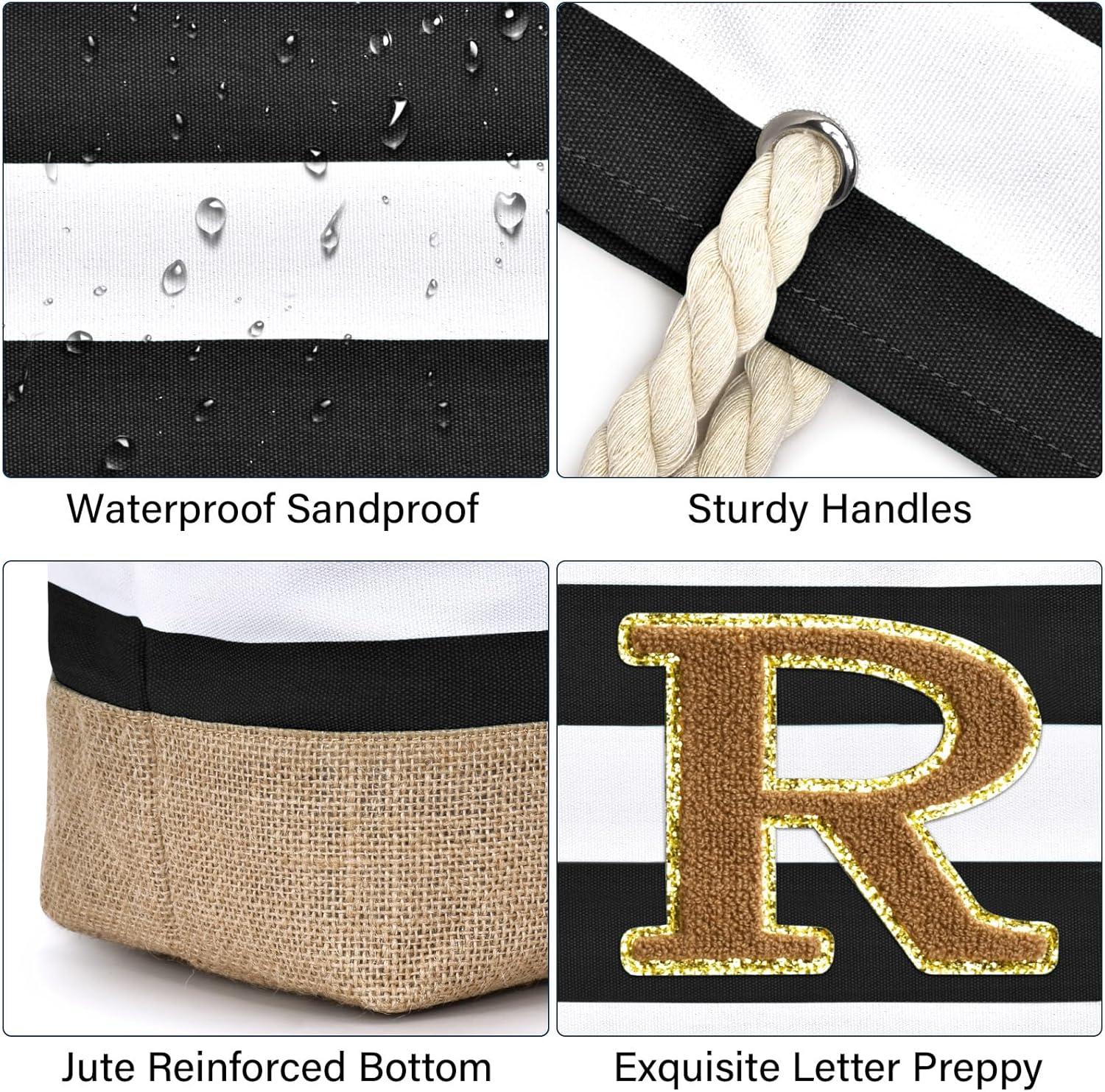 - Stylish & Unique Design: Adorned with a chic, stitched chenille letter edged in gold, the canvas tote bag is both stylish and unique. The letter symbolizes your individuality, while the classic stripe pattern and reinforced jute bottom add a touch of sophistication, making it suitable for any occasion