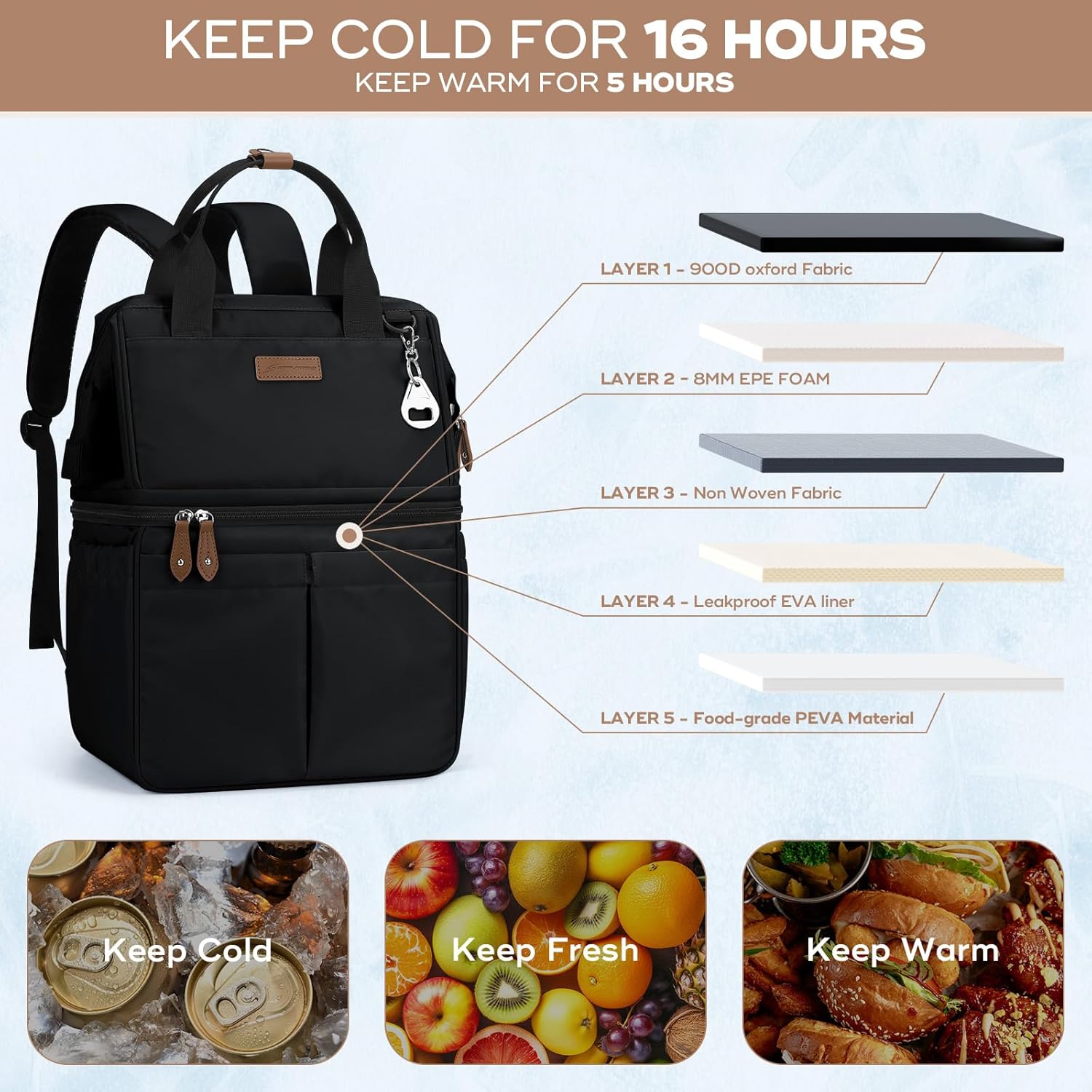 - Hot & Cold Separation Design: The double-layer cooler backpack is uniquely designed with an upper compartment for dry storage and an insulated lower compartment for storing beverages or food, which meets the needs of different scenarios of use; you can use it as an insulated lunch backpack, or as a portable cooler for the beach, picnics, hiking, fishing, camping, traveling, or other outdoor activities.