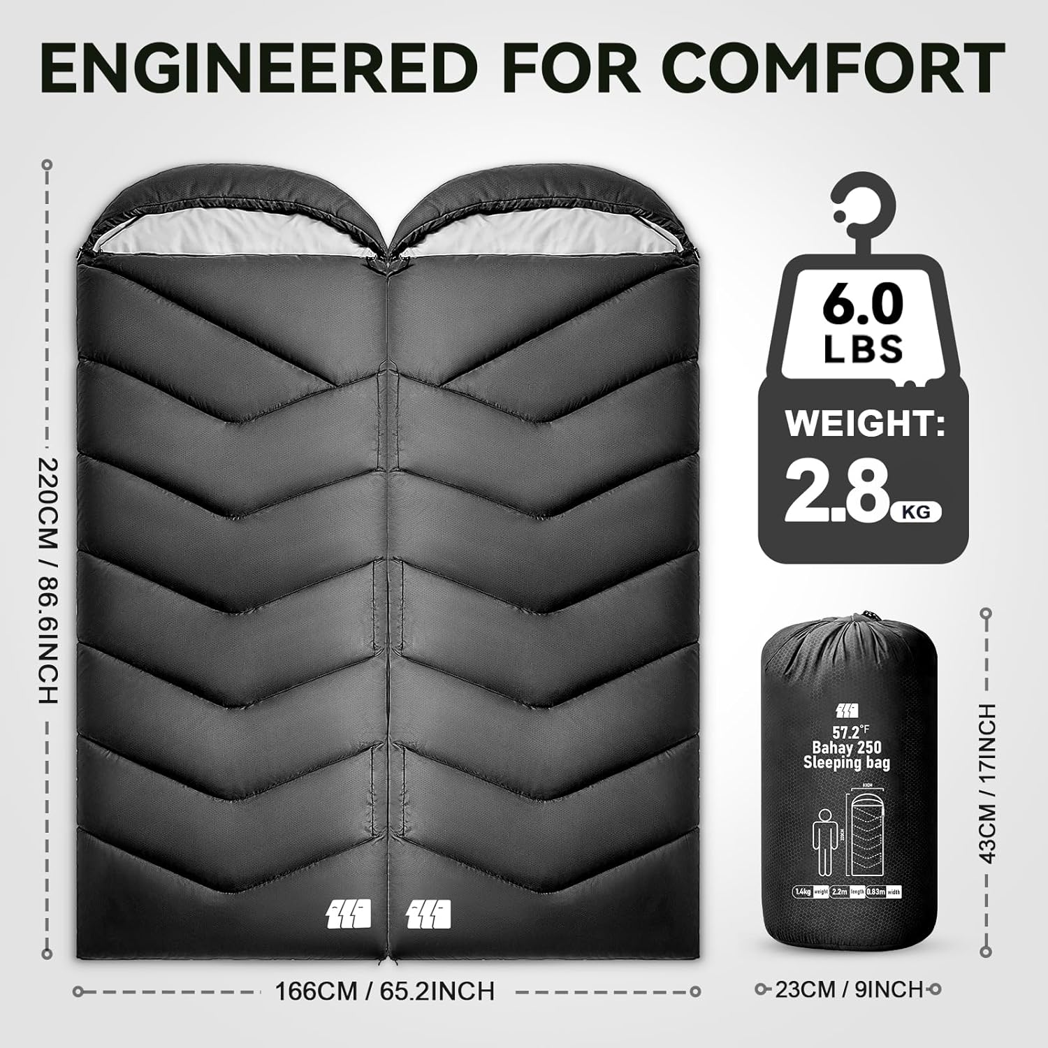- 【GREAT SLEEPING BAGS FOR ADULTS AND KIDS】SIZE: 32.5 by 86.6 inches (W x D),More spacious than a regular sleeping bag. Opens up to make a nice comforter,making them ideal for tall teens, adults, or family camping trips.The width of the double sleeping bag is 64 inches, suitable for camping with your friends.