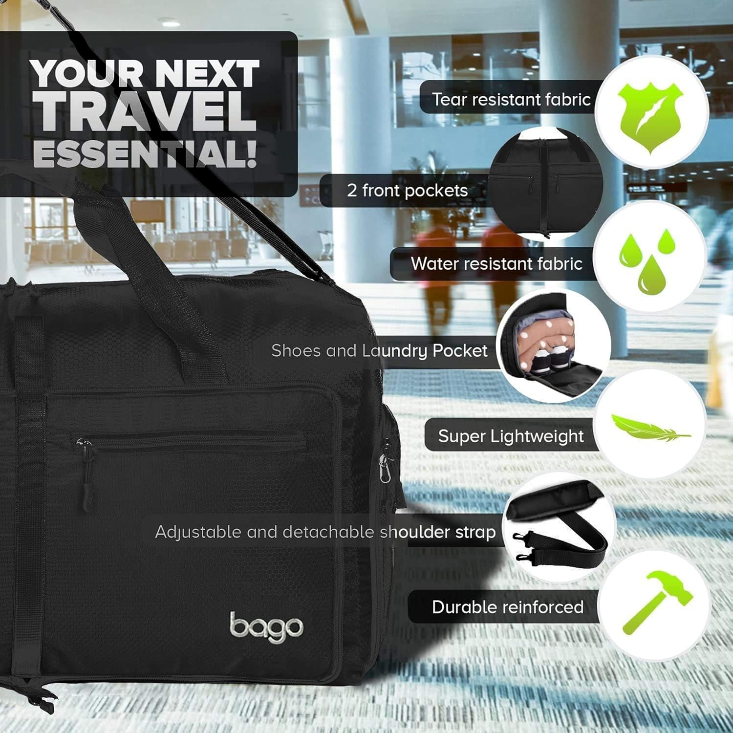 Bago Large Foldable Duffel Bags for Traveling Women & Men - 80L Packable Duffle Bag for Travel with Shoe Compartment - Water Repellant, Heavy Duty, Lightweight Folding & Collapsible (All Black)