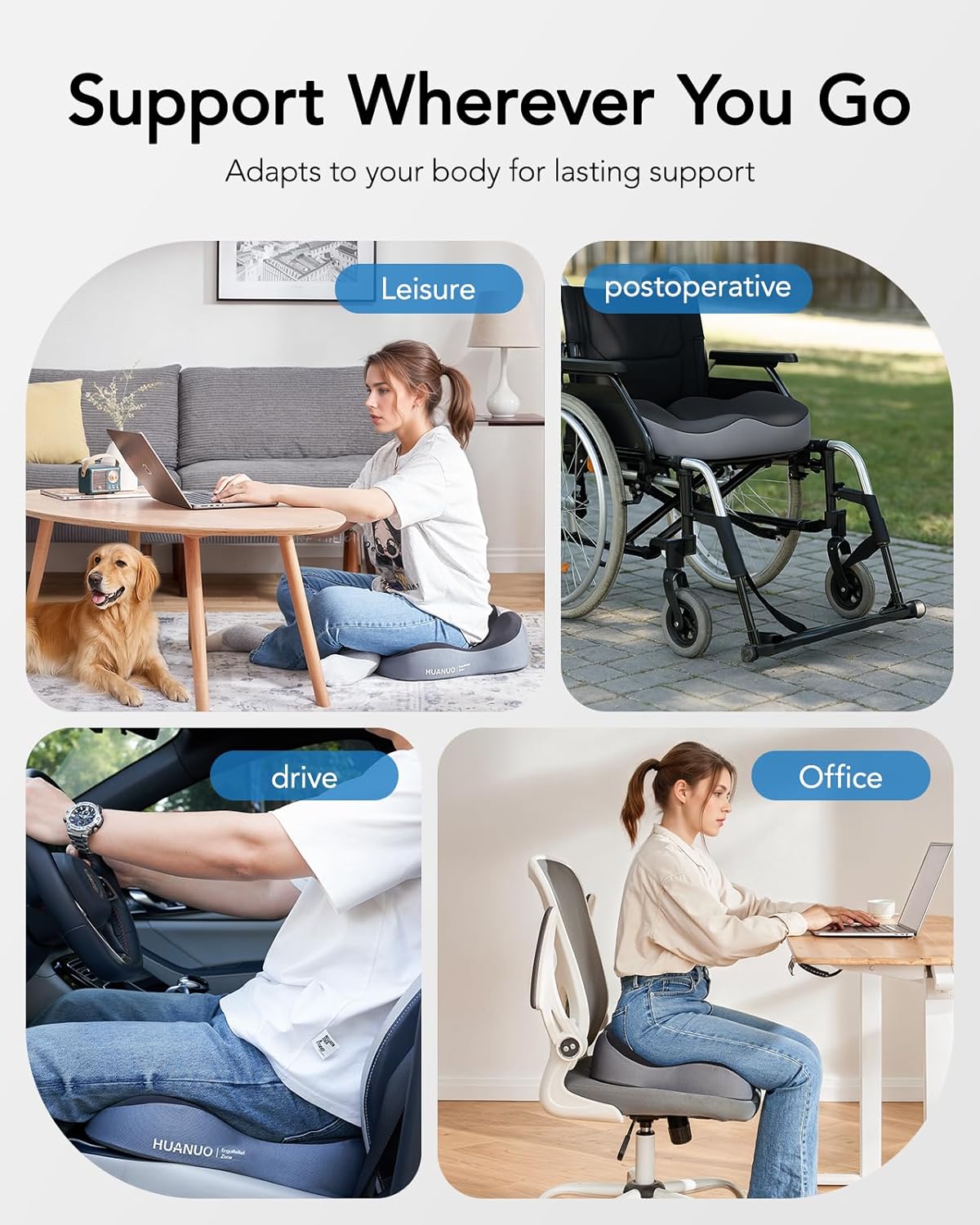 HUANUO Office Seat Cushion for Tailbone Support, High-Density Memory Foam Cushion, Breathable Coccyx Cushion, Non-Slip Bottom for Sciatica Relief, Perfect for Office, Car, and Wheelchair
