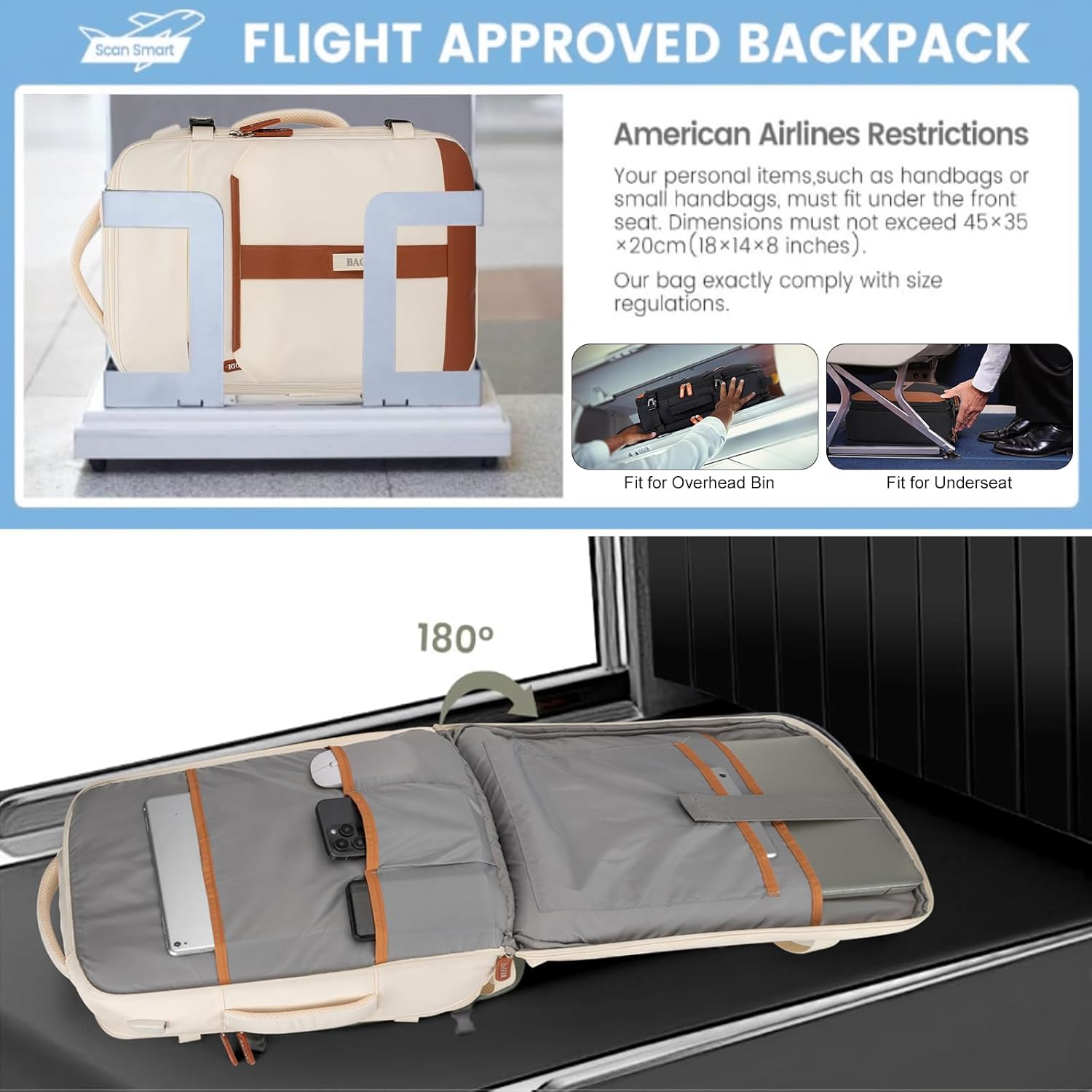 - ✈【Airline Approved Personal Item】: With dimensions of 14 x 18.5 x 7.5 inches (expandable to 9.5 inches in width), this carry-on backpack meets IATA airline size standards. It fits perfectly in overhead compartments or under the seat, making it ideal for airlines like Spirit, Frontier, EasyJet, JetBlue, and more. The backpack opens 90-180 degrees for easy airport security checks.