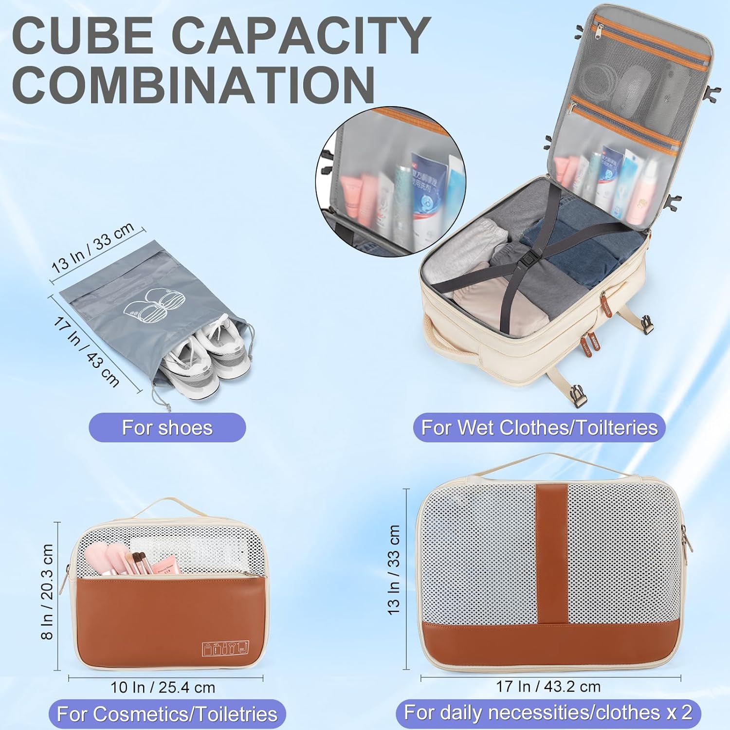 - ✈【Packing Cubes & Wet/Dry Separation】: Includes 3 packing cubes (2 for clothing and accessories, 1 for shoes up to 16.5 inches in length). A high-density waterproof pocket keeps toiletries or wet clothes separated, maintaining cleanliness and order during your trip. The shoe bag ensures your footwear stays organized and separate.