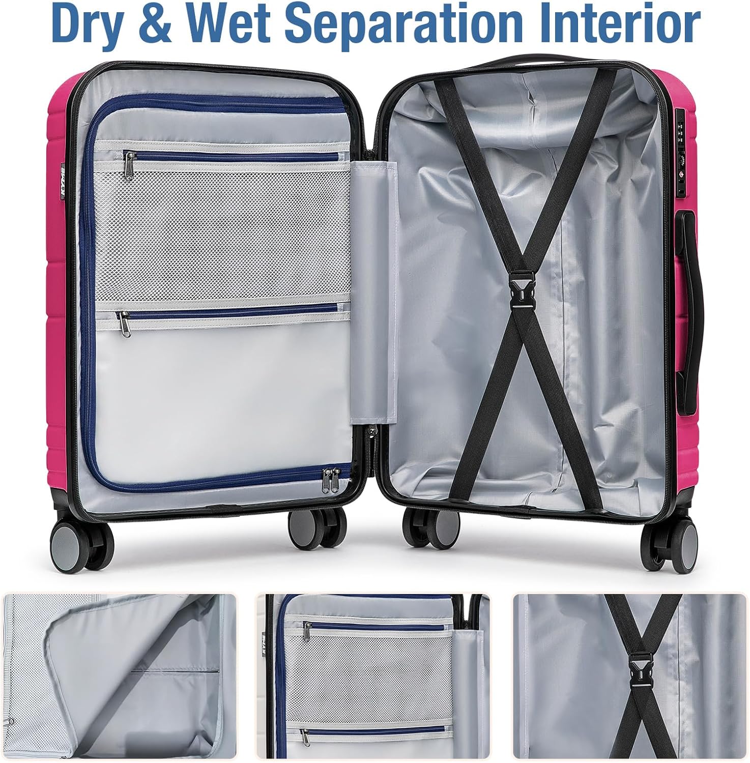 - SPACIOUS INTERIOR: These hardshell expandable 22x14x9 carry-on luggage has multiple storage compartments for easy packing.The main compartment has "X"-shaped cross straps to keep clothes in place. The left side compartment has two zipped mesh pockets for wet and dry storage.Soft silicone handles on the top and sides provide a variety of comfortable carrying options