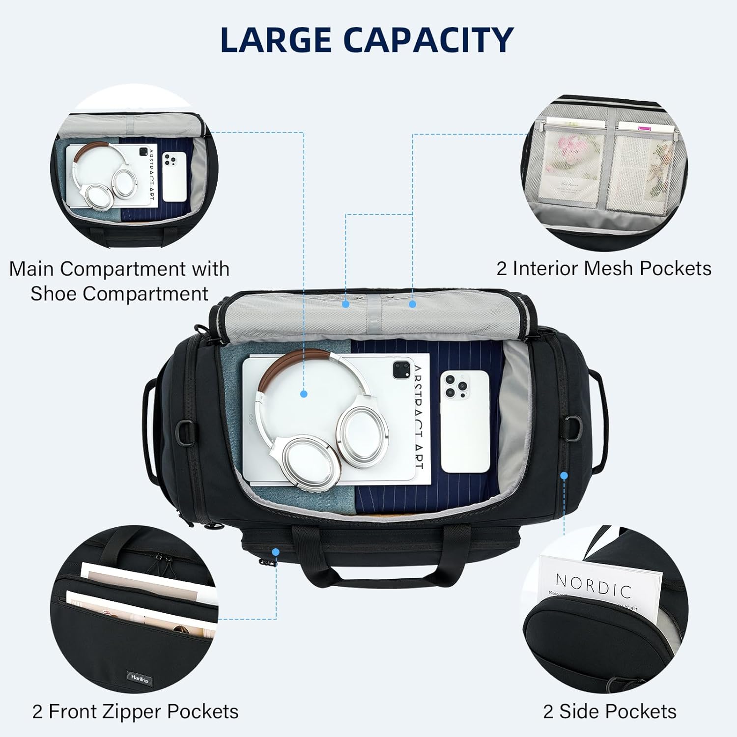 - [Extra Large Capacity] This 55L large duffel bag provides 8 specialized compartments. In the main compartment, it's roomy enough to accommodate 3-5 days clothings and various tech products, 2 mesh pockets for valuables like wallet, card, cash, toghther with ventilated shoe compartment. Moreover, 2 front quick-access pockets fits passports, boarding passes, books, cosmetics, phone, glasses, etc, while 2 side pockets good for bottles and umbrellas.