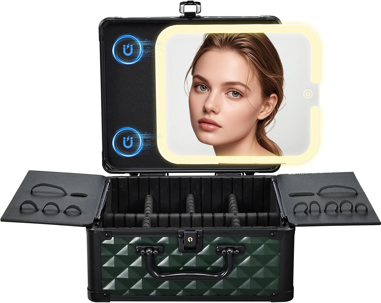Makeup Box with Magnetic Lighted Up Mirror Makeup Organizer Box Travel Cosmetic Case Portable Vanity with 3 Colors LED MirrorMake up Suitcase with Lockable Keys Dividers Brush Holder Dark Green