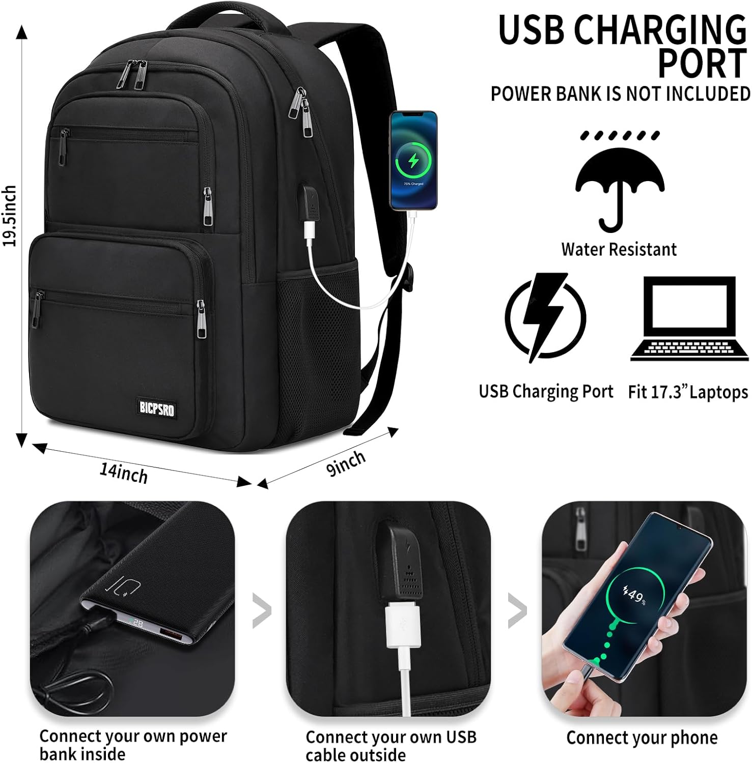 - 【USB PORT 】Charging college backpack with an external charging port & built-in charging cable, this laptop book bag with a USB charger port provides you a more convenient way to charge your electronic device via connecting your own power bank while walking or cycling. (POWER BANK is not included)