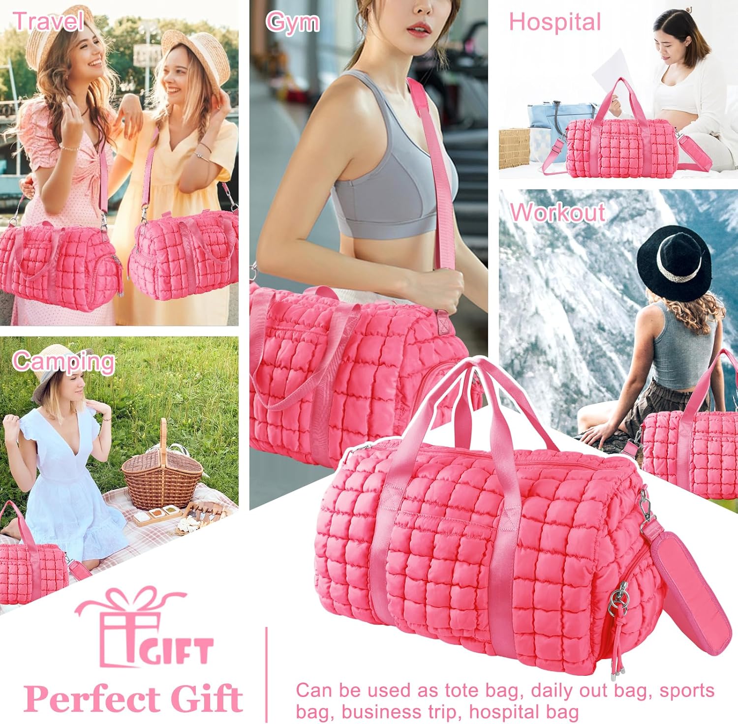 Quilted Travel Duffle Bag Gym Bag for Women,Large Puffer Duffle Weekender Bag with Compartment,Workout Overnight Carry on Organizer Bag Duffle Bag for Airplane Travel(L-Pink)