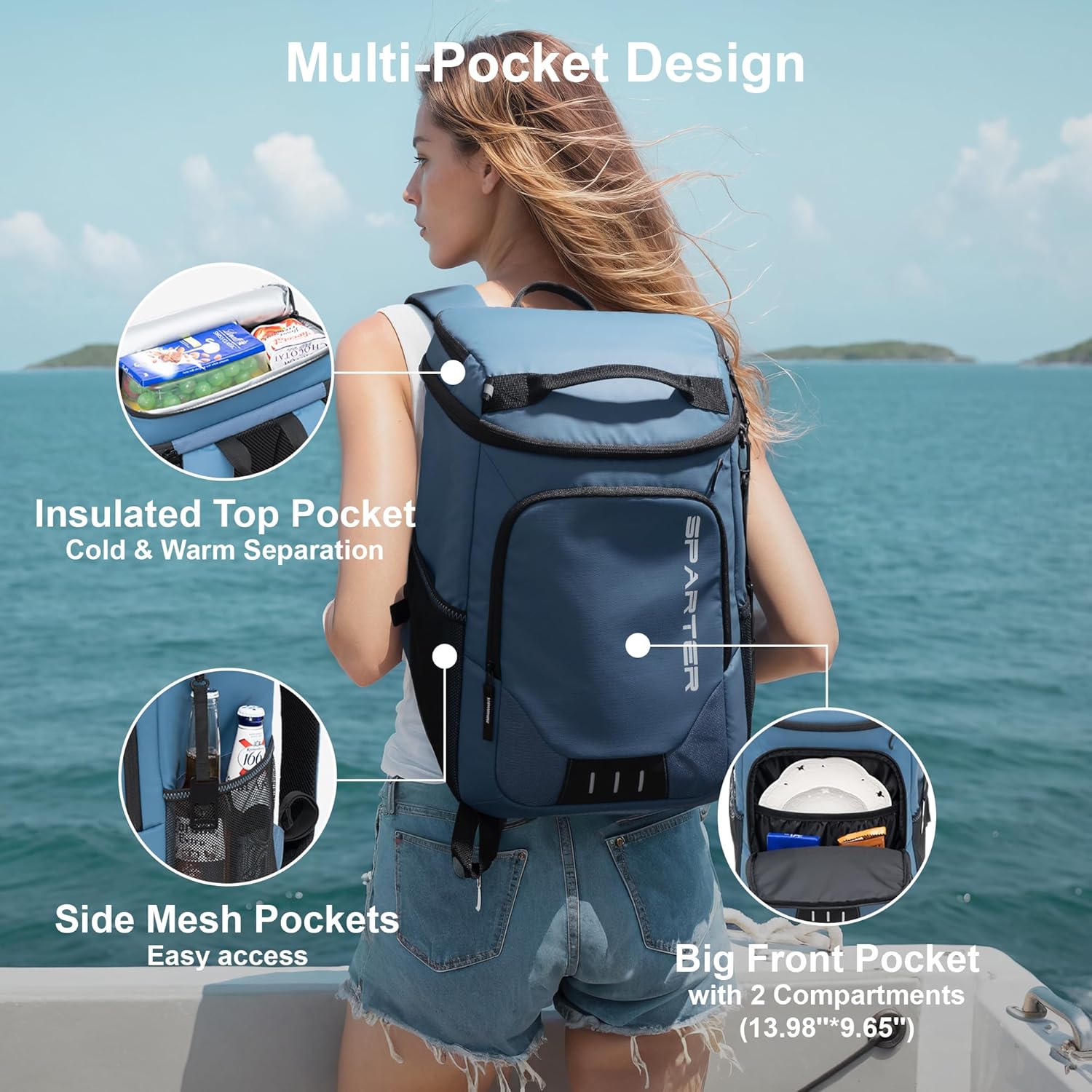 - Double Insulated Compartments & Multi-Pockets: Featured two insulated compartments for cooling drinks & dry foods, front big pocket and two side pockets for your snacks, phone, wallet, and other accessories. A bottle opener included for more convenience.