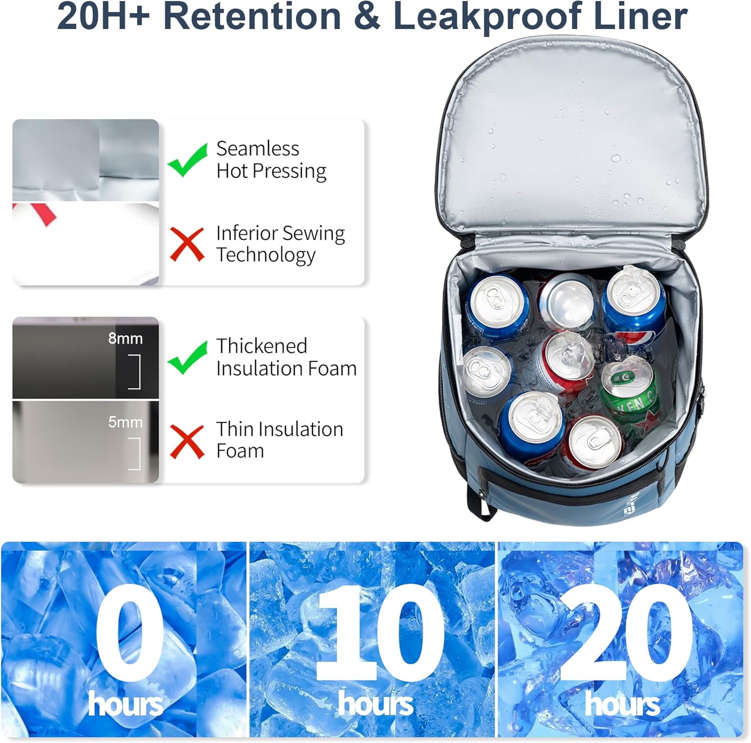 - 20 Hours Retention: Sparter backpack cooler is insulated with thickened 8 mm foam, together with advanced silver PEVA seal to keep beverages cool up to 20 Hours throughout the day for beach picnic, hiking, camping, trip, boating, baseball / golf and work.