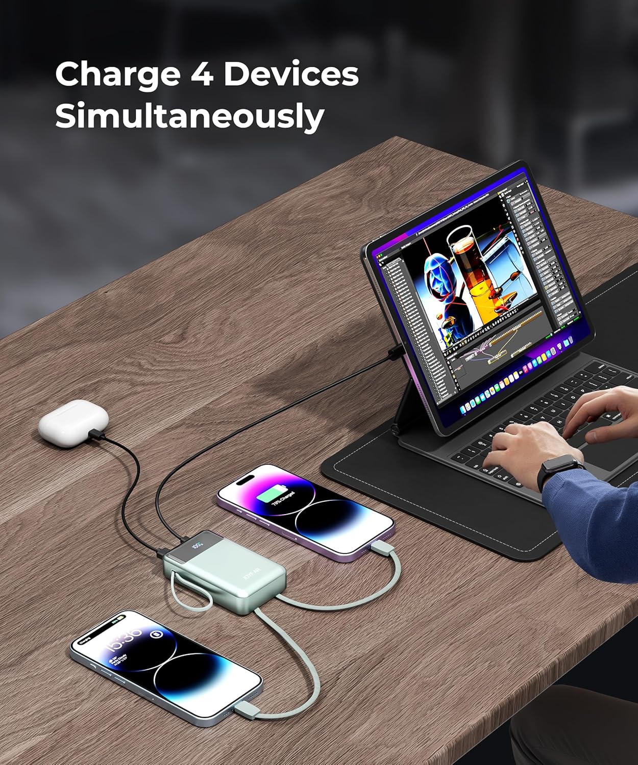 - 【Four Devices, One Charge】With 30000mAh capacity, our banks can offer 5.5 charges for the iPhone 15, 4.6 charges for the Samsung S24, and 2.7 charges for the iPad Pro. Charge 4 devices max at once, it's a must in accessories for a power outage, hurricane preparedness, and emergency. Perfect for a cruise ship travel/road trip/car journey/hiking/camping/summer day at the beach/college dorm room