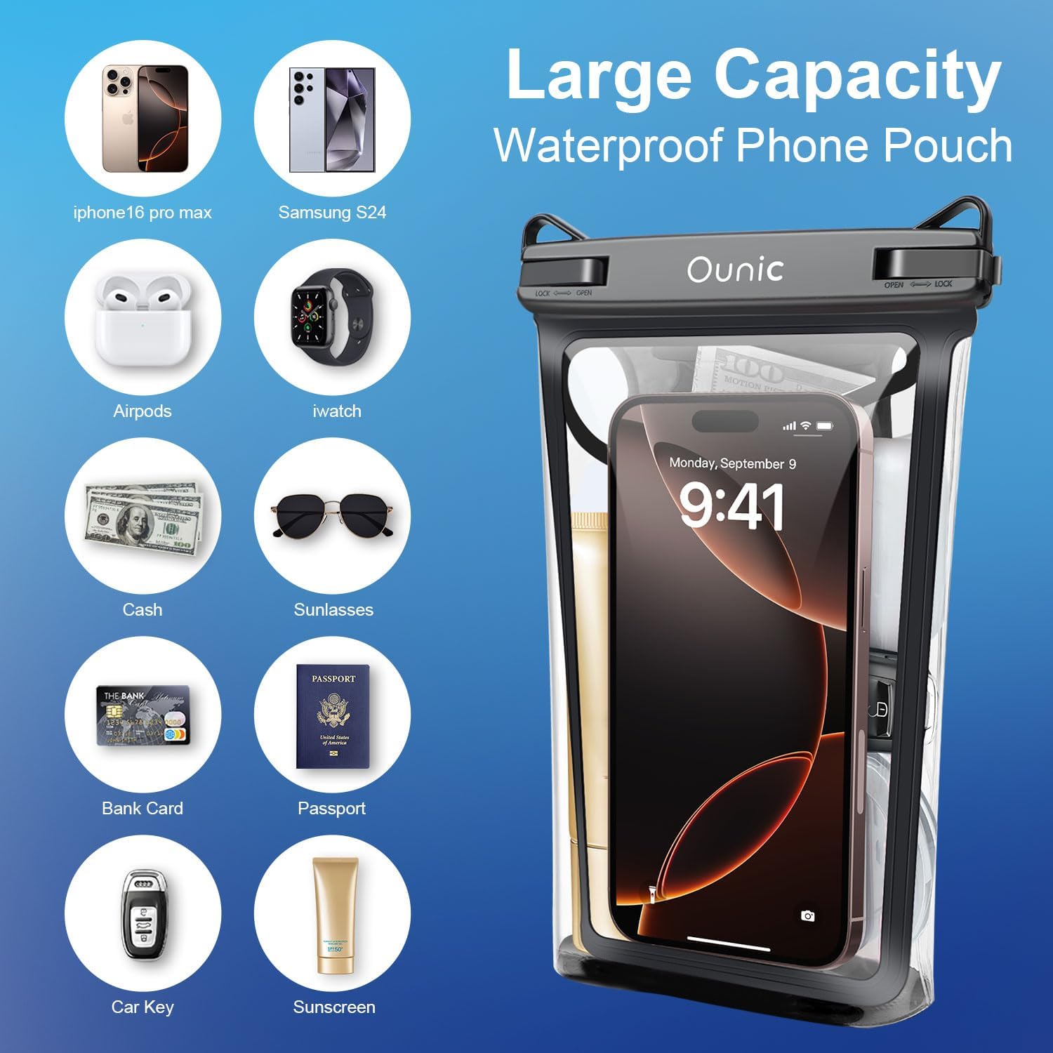- Large Capacity Design: Waterproof phone pouch has a larger capacity than regular waterproof bag with a cell phone compartment and an item pocket and comes with a separate card case compartment.Suitable for iPhone 16 15 14 13 12 Pro Max Galaxy S25 S24 S23 Pixel8