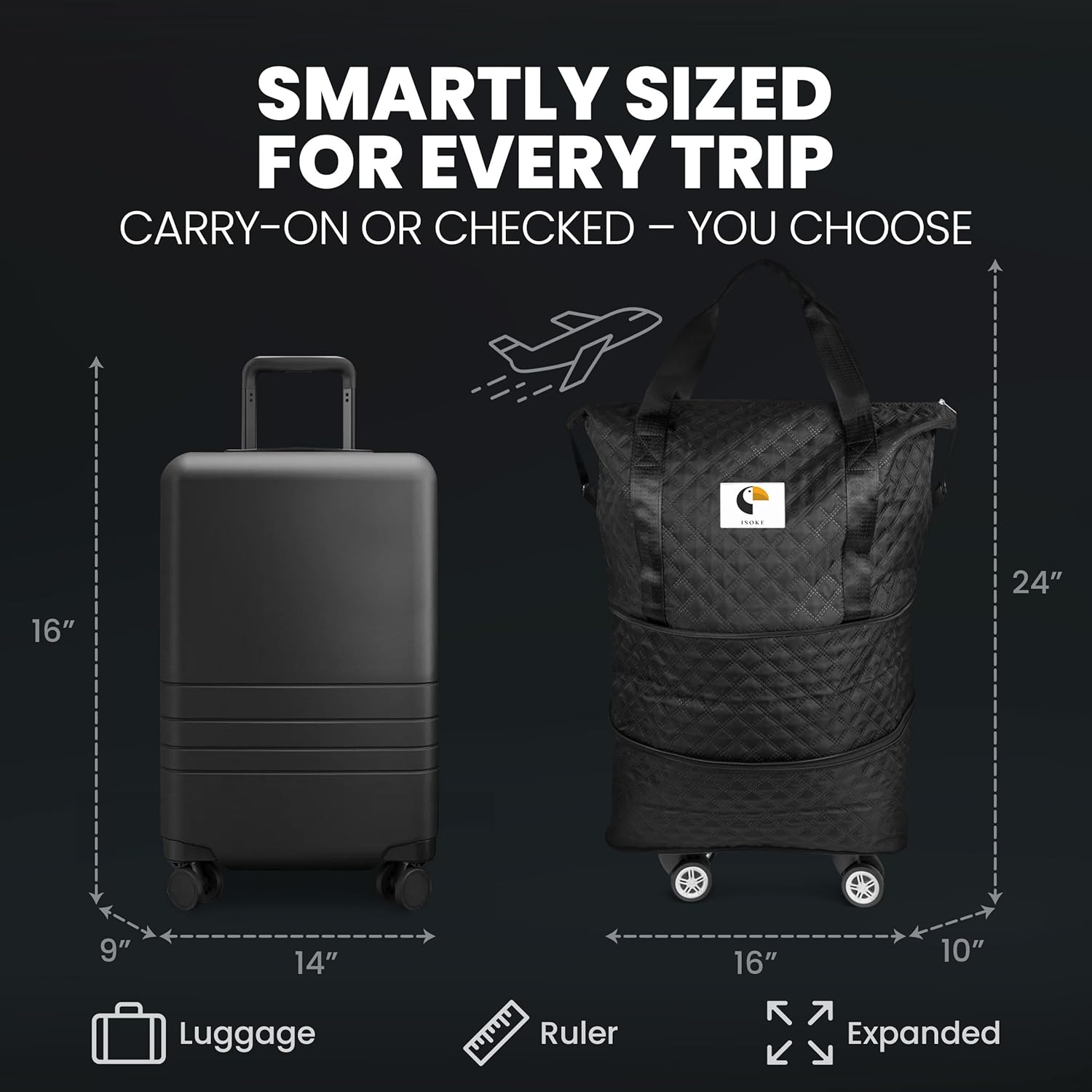 ISOKE Foldable Travel Duffel Bag - TSA Approved - With Wheels & Shoe Compartment - Weekender Bags for Women - Carry On Overnight Bag - Black - 16"×10"×24"