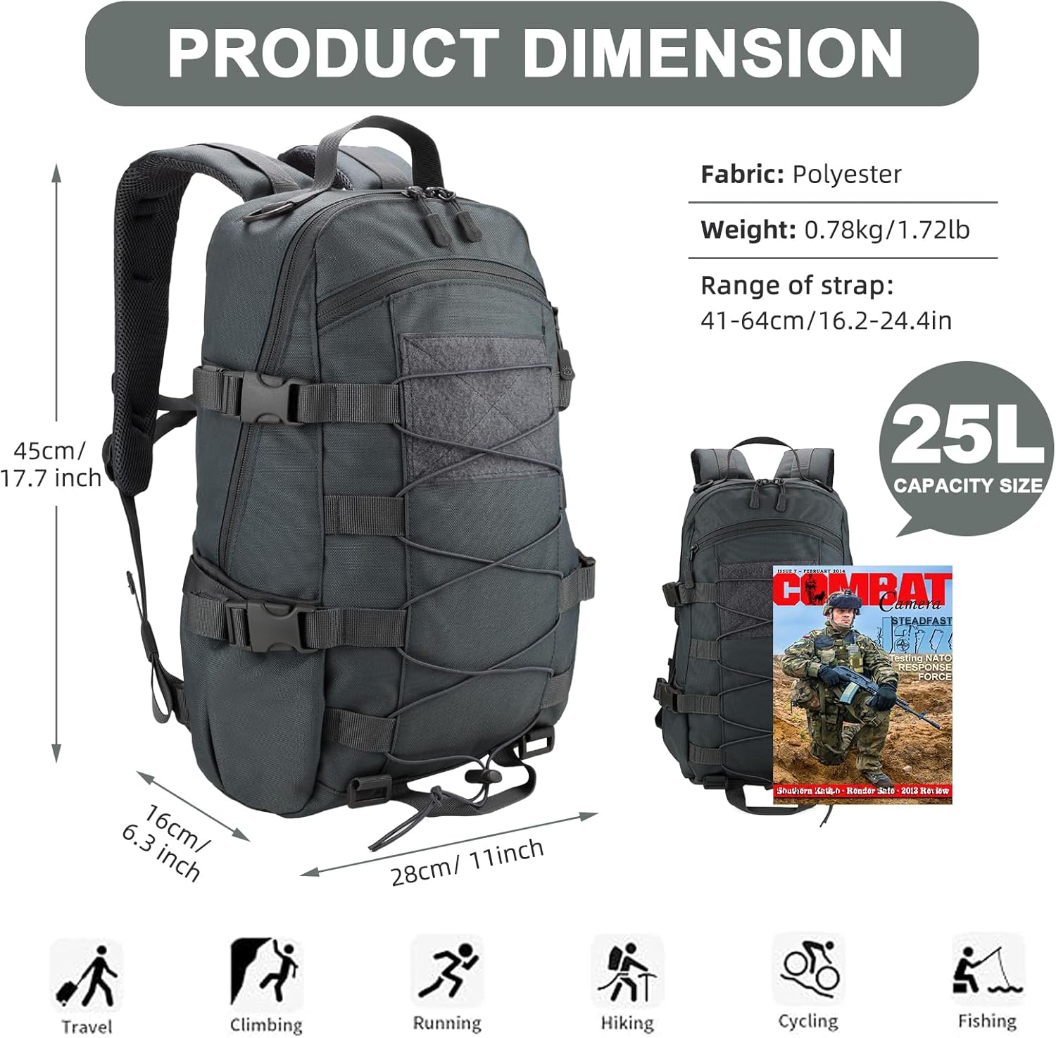 25L Hiking Backpack Small Tactical Backpack Daypack Camping Trekking Hunting Molle Pack for Men Women, Grey