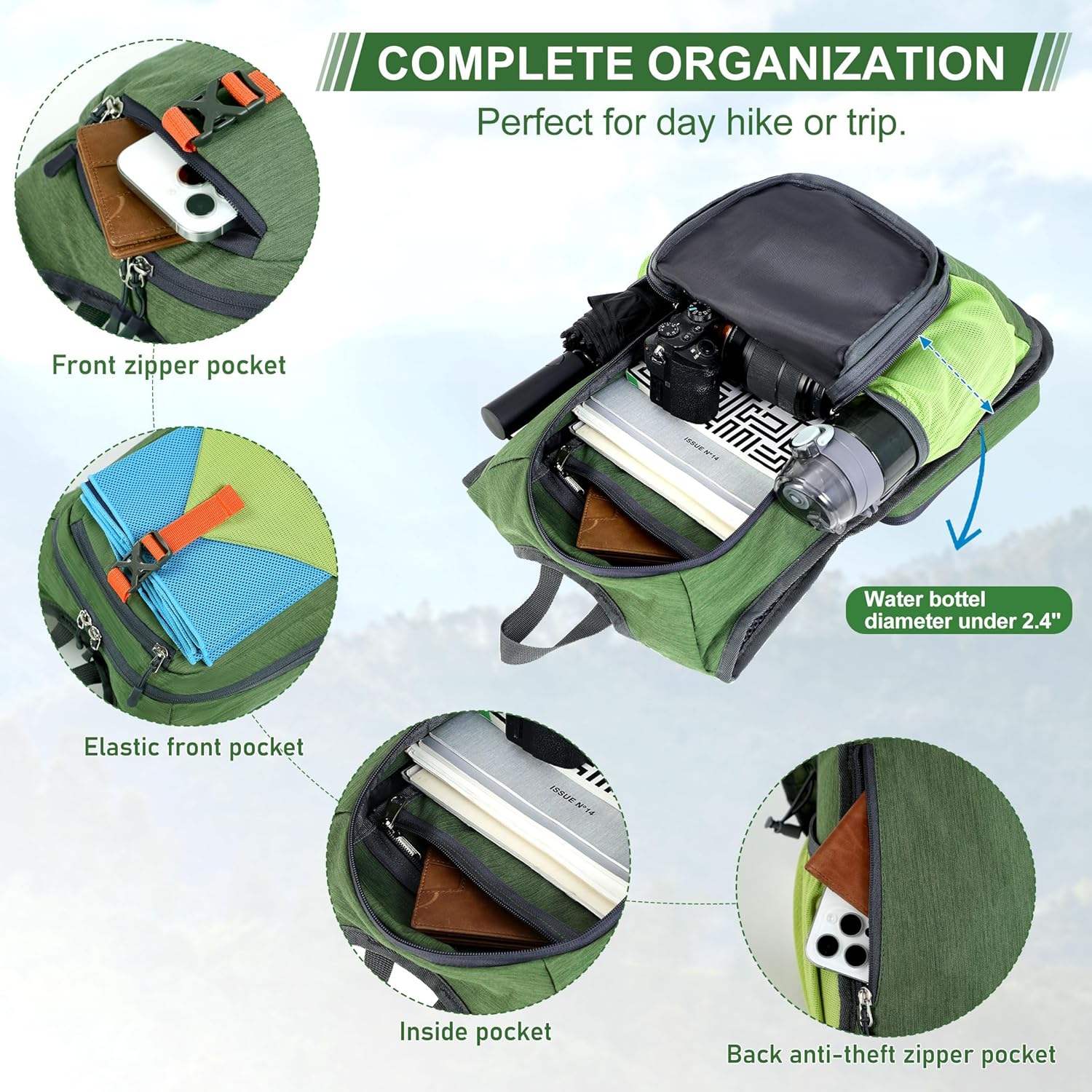 - Smart Storage Compartments: Three spacious main compartments, two mesh side pockets (fits 2.4'' diameter bottles), and a hidden anti-theft rear pocket keep gear neatly sorted. Securely store wallets in the back, stash snacks in the front, and use the elastic-lined pockets for quick-dry towels or sunscreen. Perfect for camping weekends, gym sessions, hiking bag, or as a carry-on personal item.