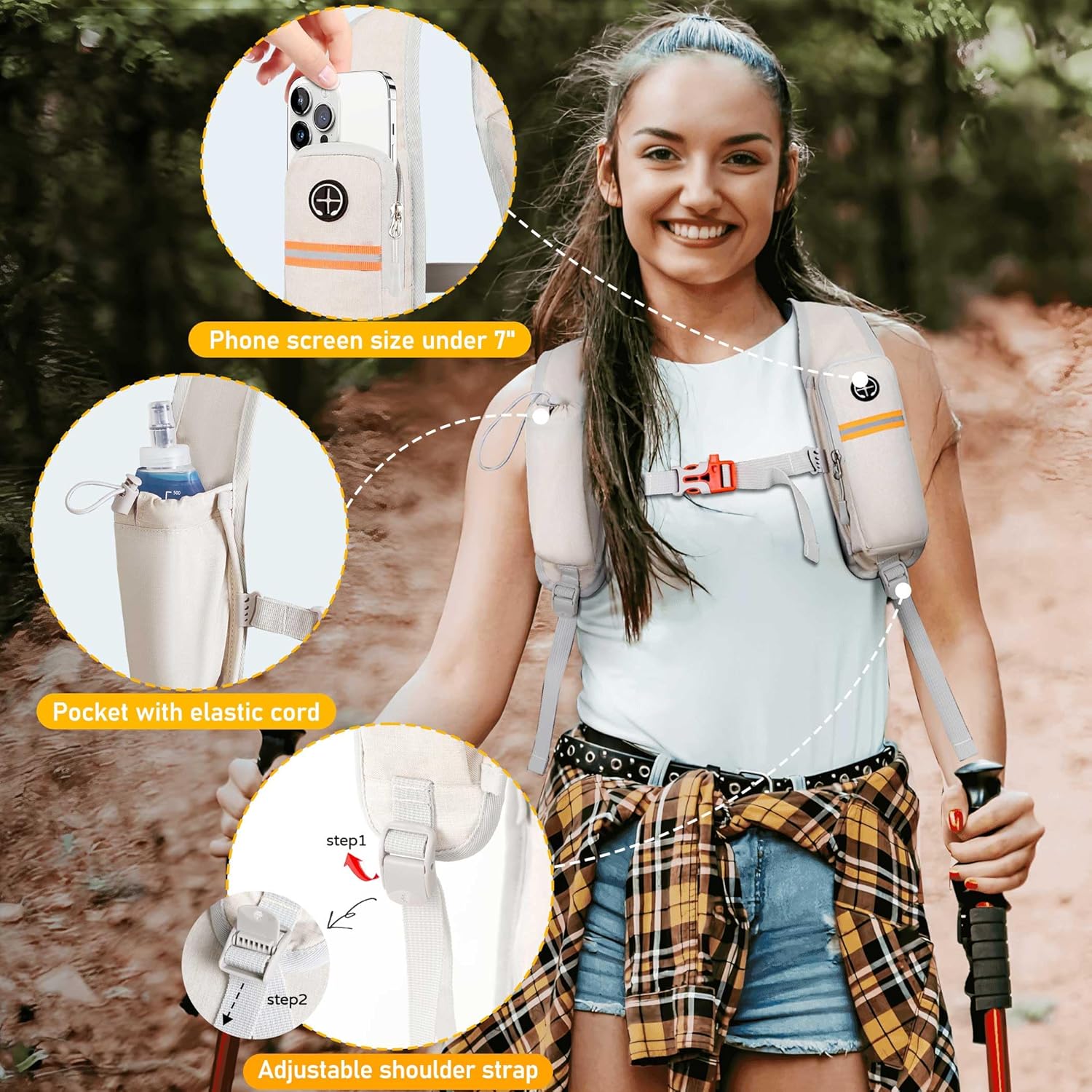 - Quick-Access Shoulder Pockets: Stay organized on the go! The ergonomic shoulder straps feature a zippered pocket (fits phones up to 7”) and a stretchy cord pouch for keys, lip balm, or transit cards. No more awkwardly removing your outdoor backpack mid-hike—grab hiking essentials instantly. Designed for active lifestyles, these pockets keep valuables secure yet within reach during biking, skiing, or city adventures.