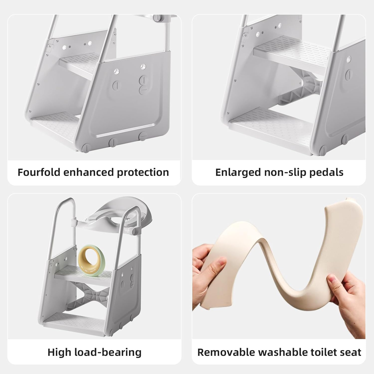 - 【Anti-Slip & Comfortable for Kids】Features textured non-slip steps and a 9” high guardrail to reduce slipping or tipping. Soft, waterproof PVC cushion is gentle on sensitive skin, providing comfort and support during potty training and daily step stool use.