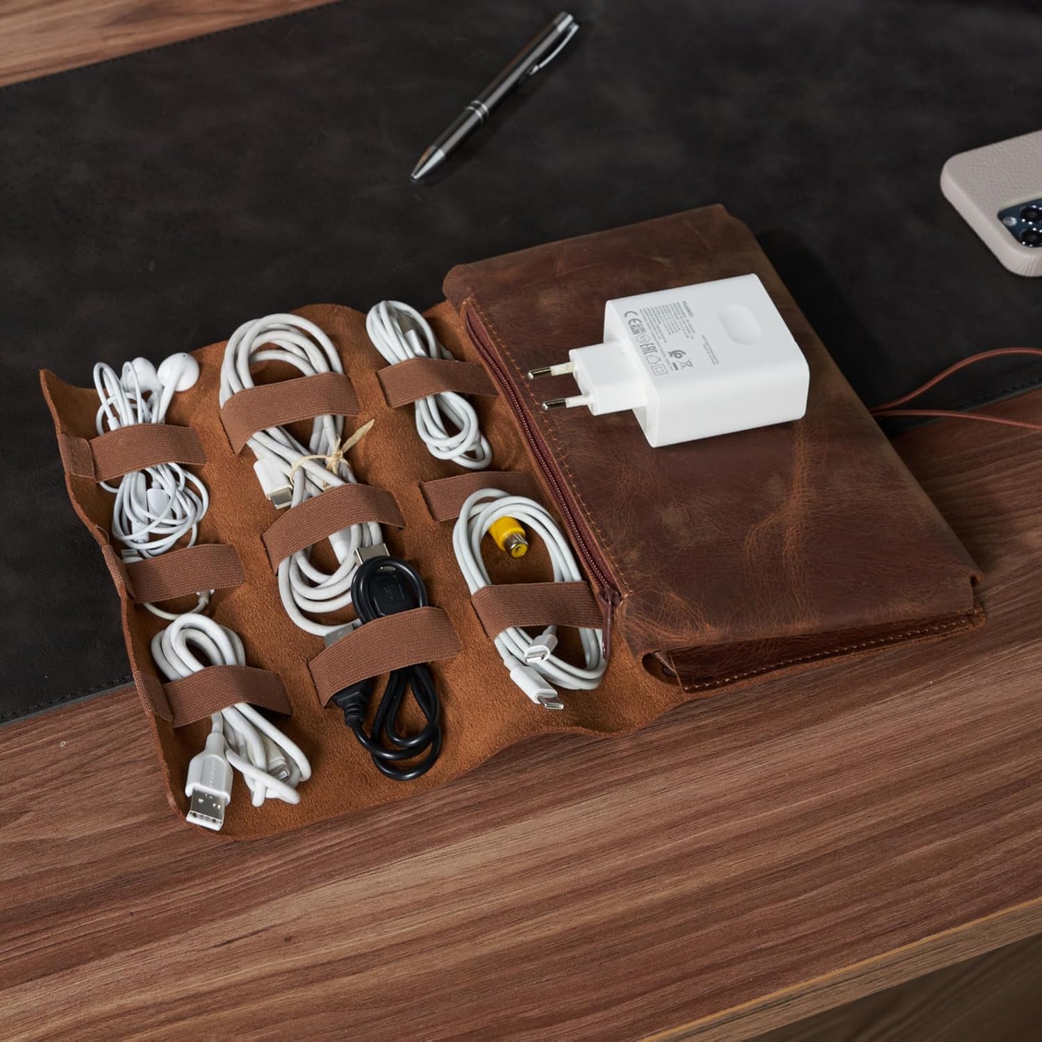 HARDISTON Custom Genuine Leather Electronic Cable Organizer Bag Handmade Travel Cord Organizer Roll Case for Hard Drives, Cables, Charger, Phone, USB, SD Card