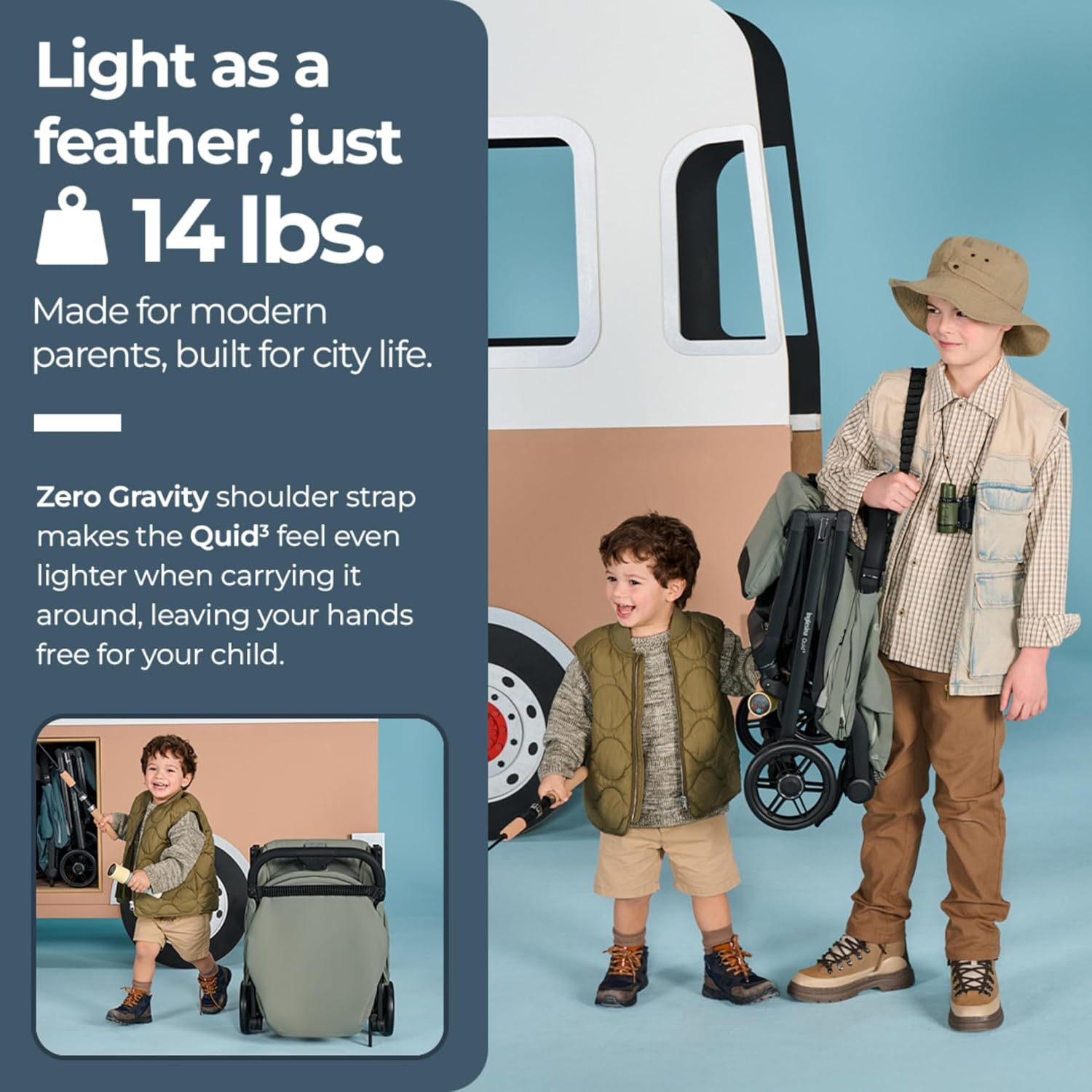 - ZERO GRAVITY SHOULDER STRAP: The integrated Zero Gravity shoulder strap makes the Quid³ feel even lighter when carrying it around, leaving your hands free for your child. Removable bumper bar is included and can be easily detached for extra compactness.