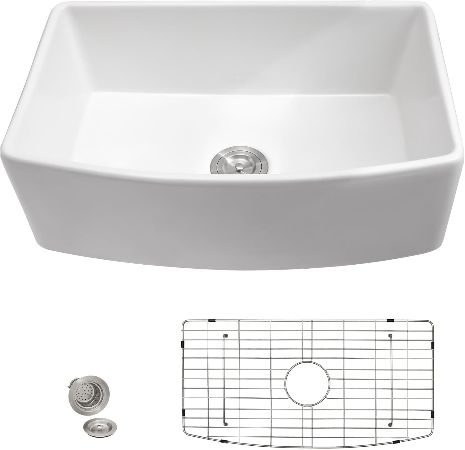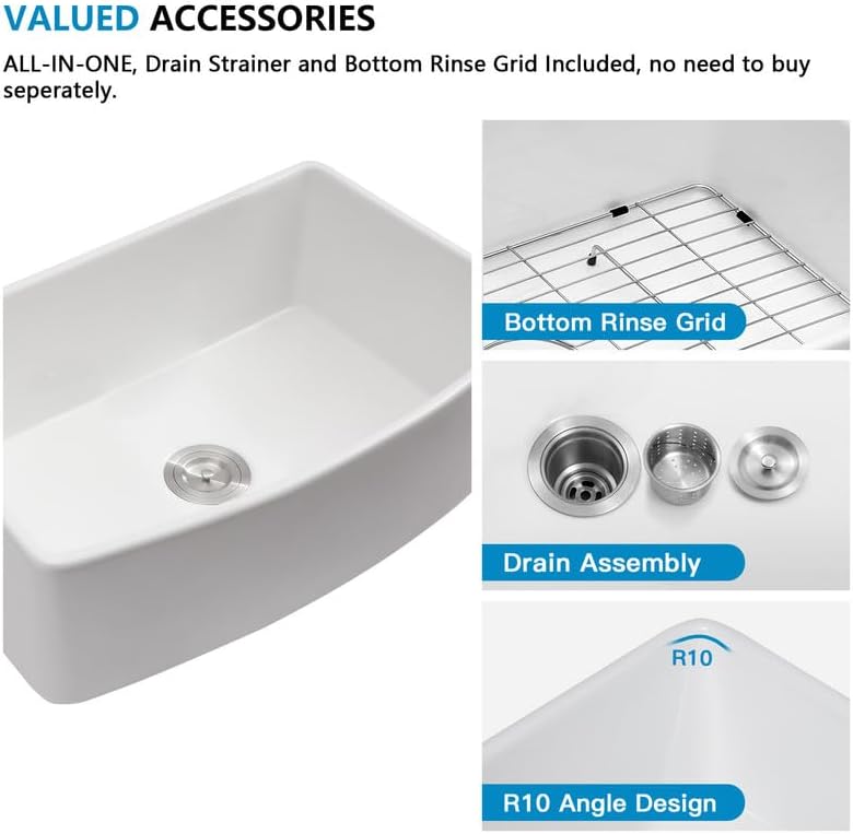 - The white farm sink offers a sleek, modern Curved design that seamlessly complements any kitchen style, enhancing your kitchen's aesthetic, please order with confidence, We provide a 3 months effortless exchanges and returns policy, if any quality issues about the 30 farm sink, pls reach out to us, Our customer care team is always ready to help you.