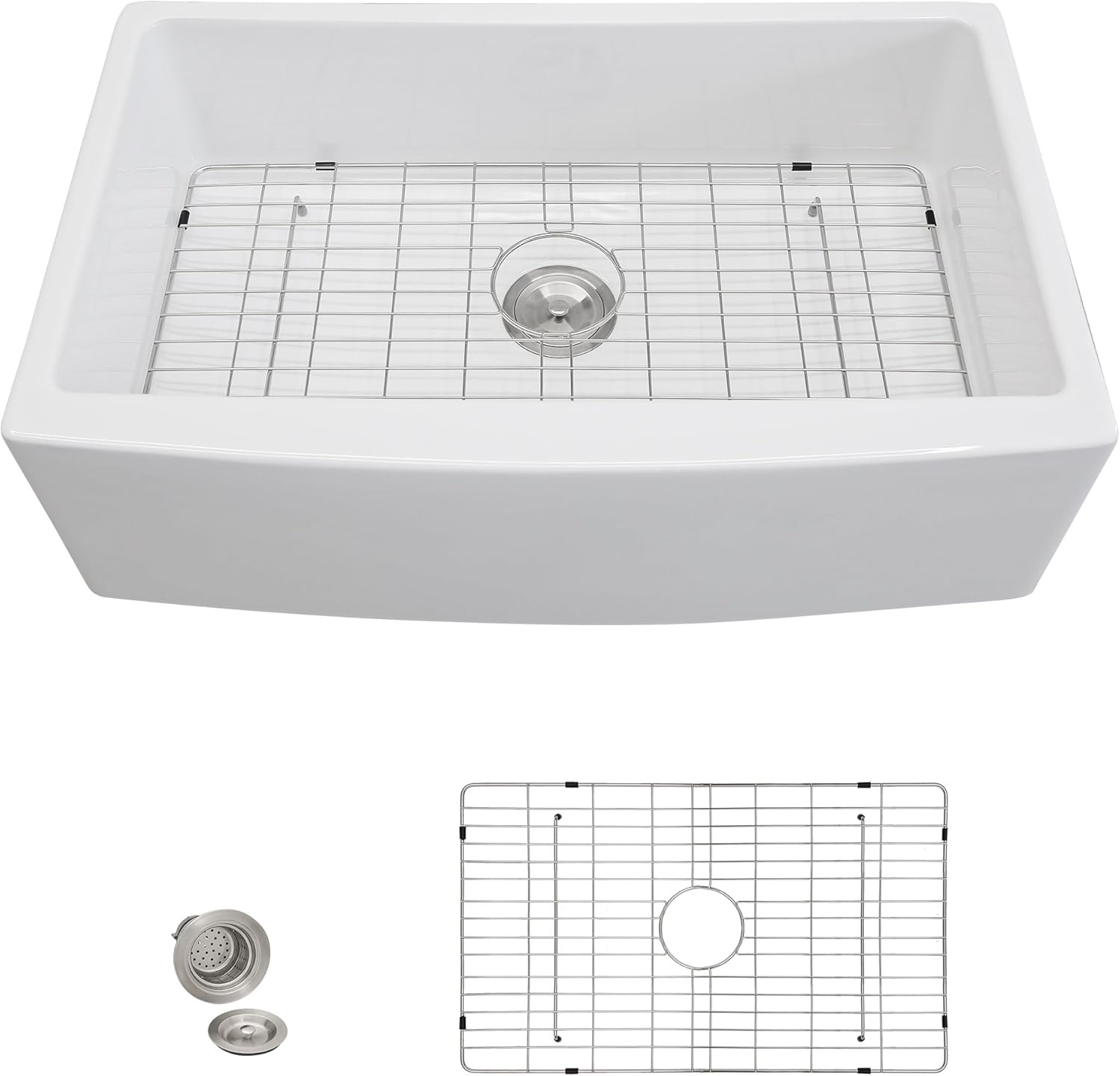 - 33 inch white curved apron front farmhouse sink is made of premium natural fire-resistant clay, fired at 2900°F, with an enamel high-gloss finish that makes it resistant to chips, fading and scratches, and sturdy enough to withstand high-temperature cookware.