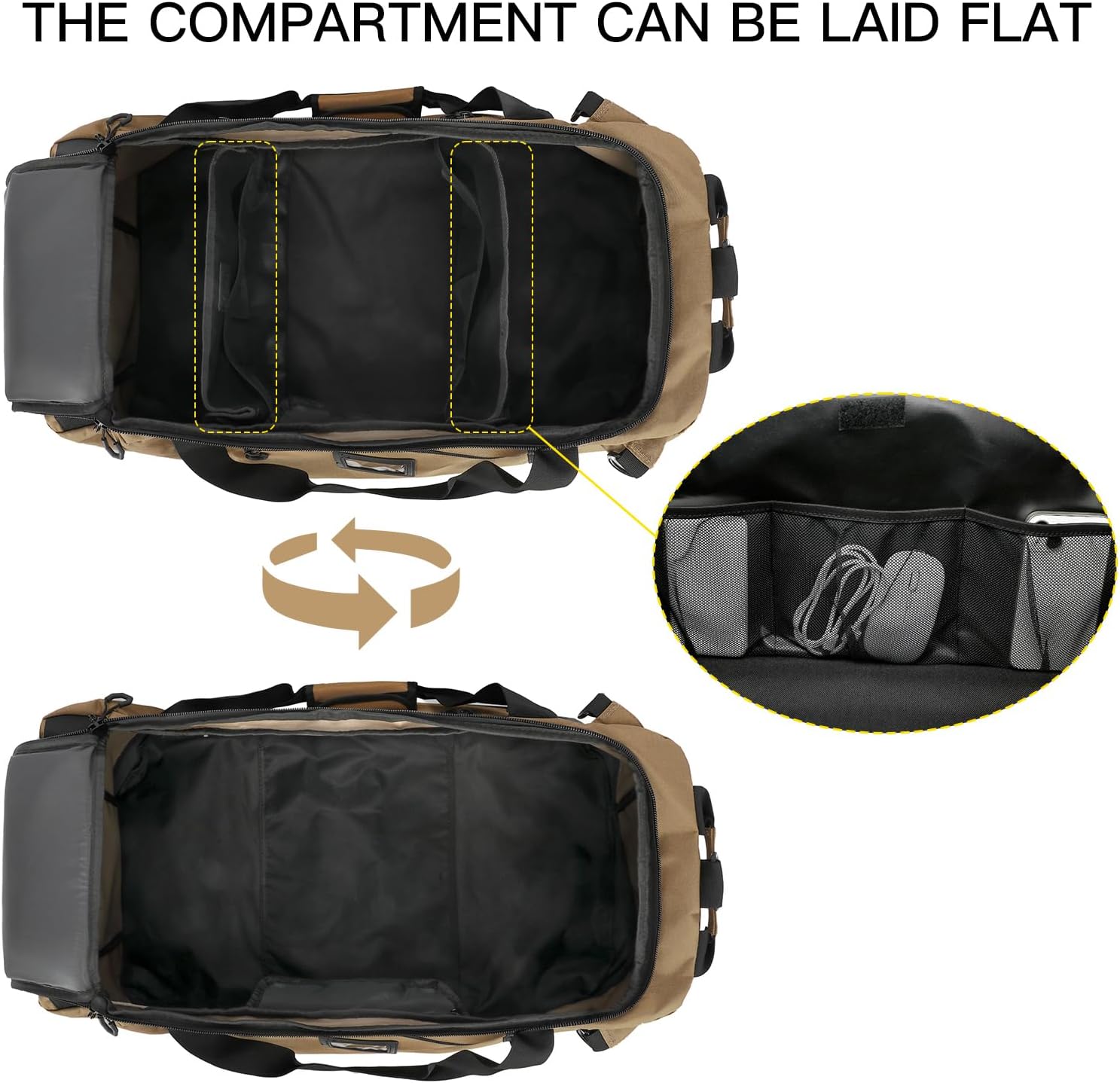 - Durable Heavy-duty Travel Duffel Bag: Made of high-quality 900D fabric, with a waterproof PVC at the fabric, the double-layer fabric is more sturdy and scratch tear resistant. The stitching and stress points have been reinforced, and the 10 # main zipper is more flexible and sturdy, thickened buckles enhance durability, Premium materials making this camping duffle bag long-lasting.