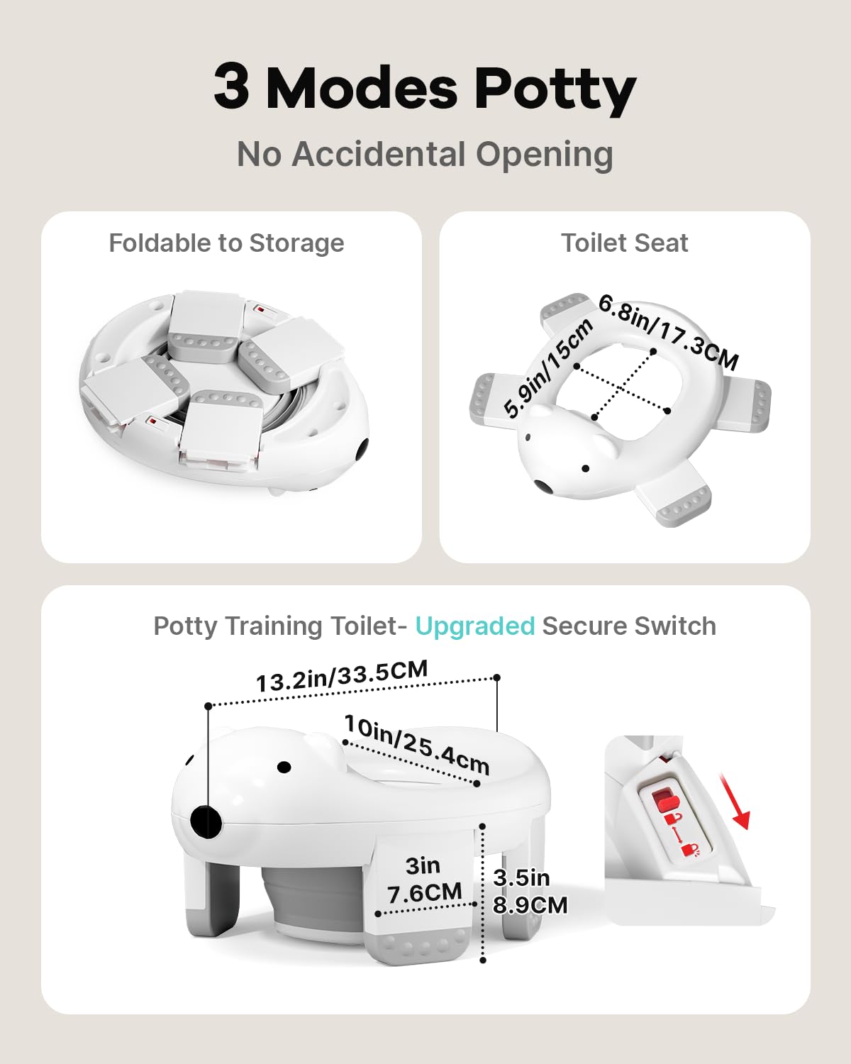- Dual-Purpose Potty: This 3 in 1 potty training seat with step works alone or attaches to the toilet. The splash guard stops messes, and its cute design is great for all kids. It's suitable for training at home or on trips