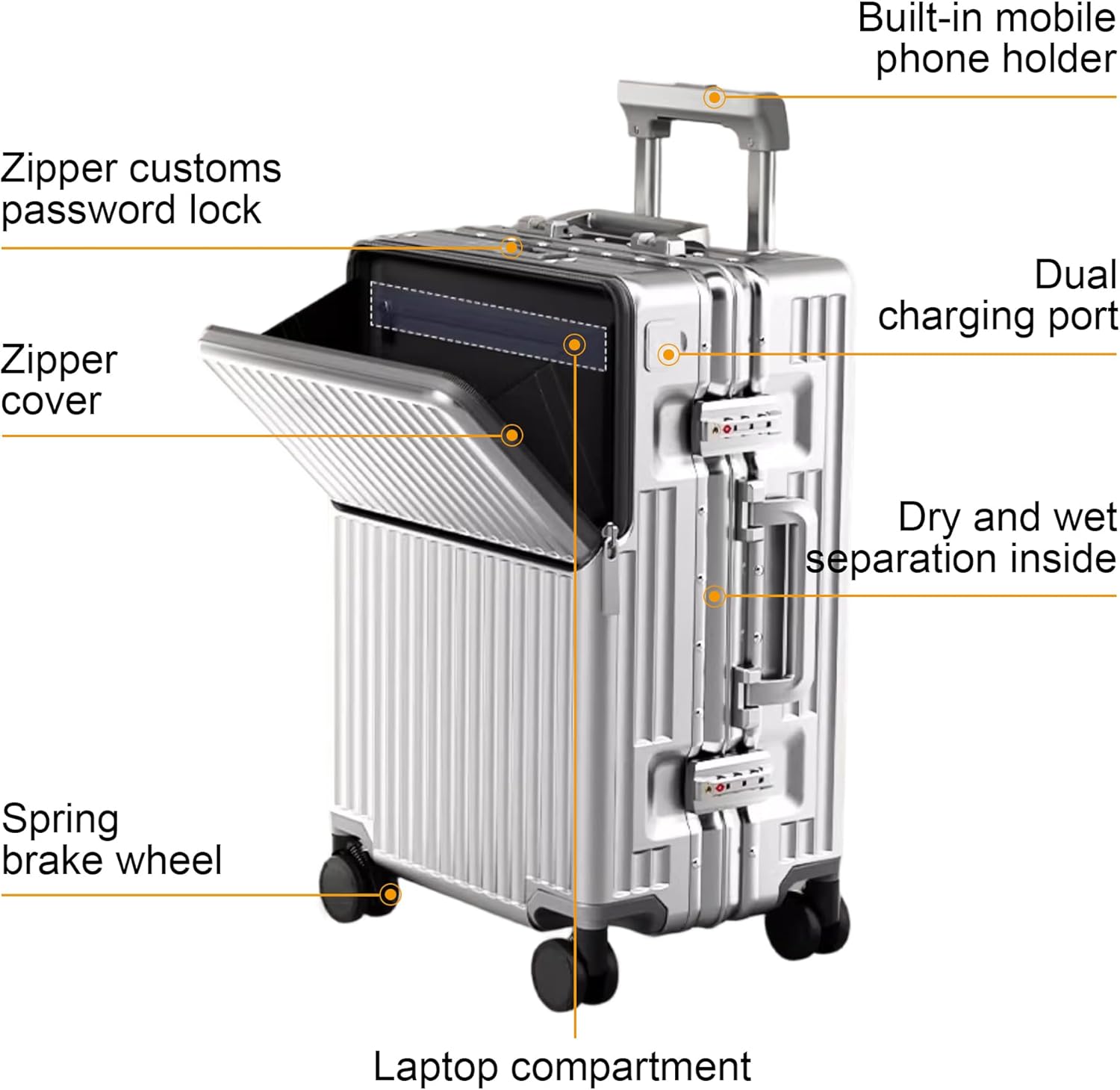 - 【Stylish and Practical】Travel case with cup holder and zipperless luggage design Designed with a built-in cup holder to keep your drinks safe, a stylish zipperless closure system for easy packing, the aluminum carry-on luggage looks stylish and modern