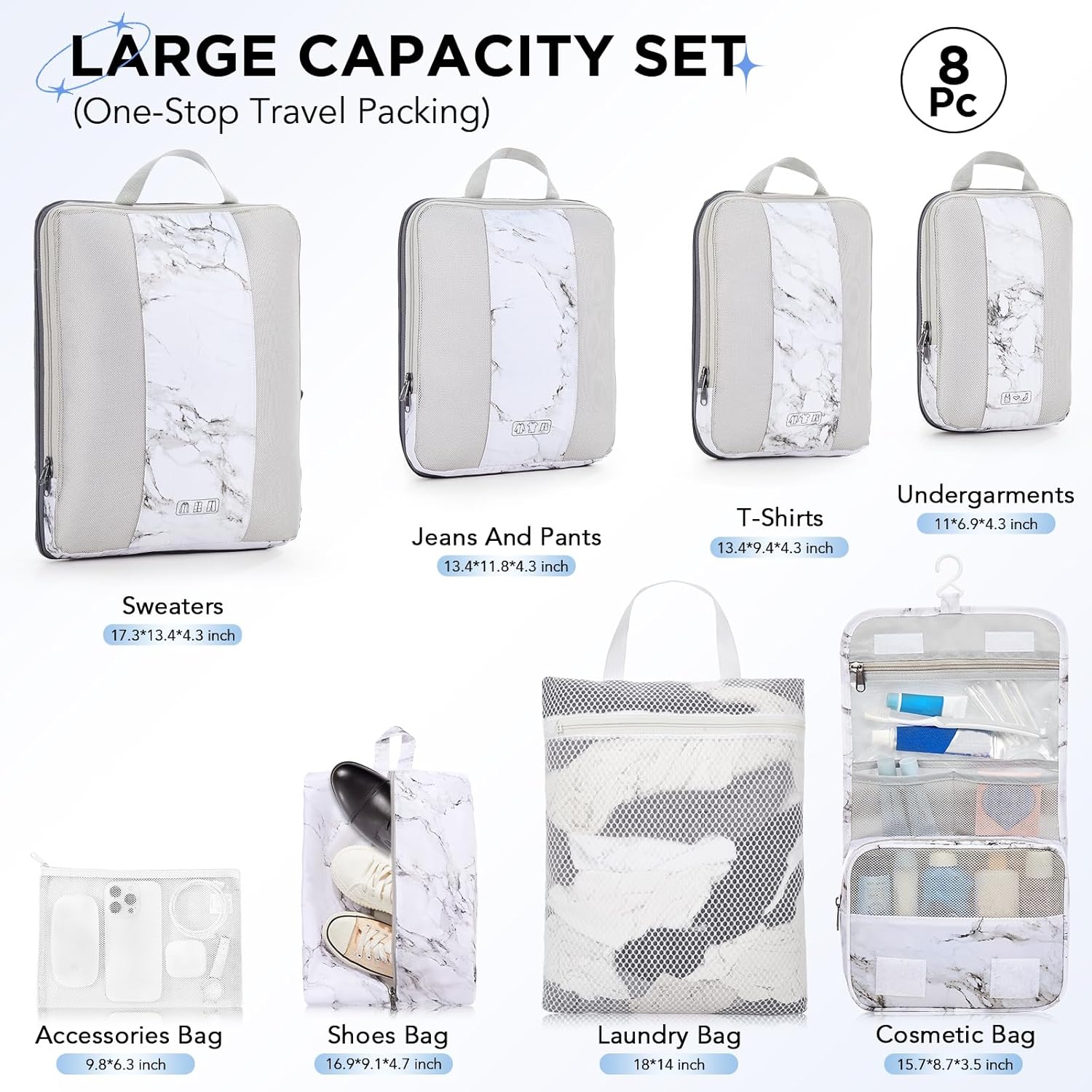 8 Set Compression Packing Cubes for Travel Essentials,Compressible Expandable Packing Cubes for Suitcase,OlarHike Luggage Organizer Bags for Travel,Handy Helper for Organizing Clothes(White Marble)