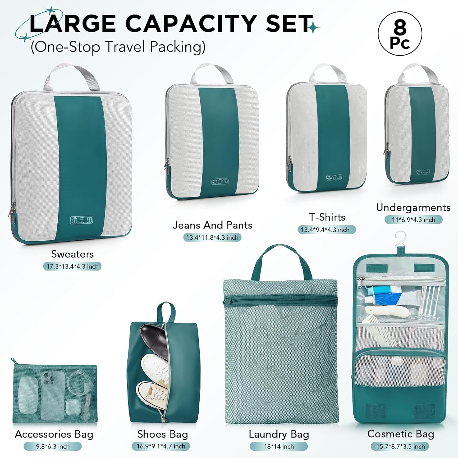 - Ready for Any Adventure - Whether you’re heading out for a weekend getaway, a business conference, or a mid-length travel, this High-Capacity 8-Piece Compression Set perfectly fits 20-28-inch suitcases, effortlessly handling all travel scenarios. We’re here to ensure you travel smarter, pack better, and enjoy every moment of your journey with peace of mind.