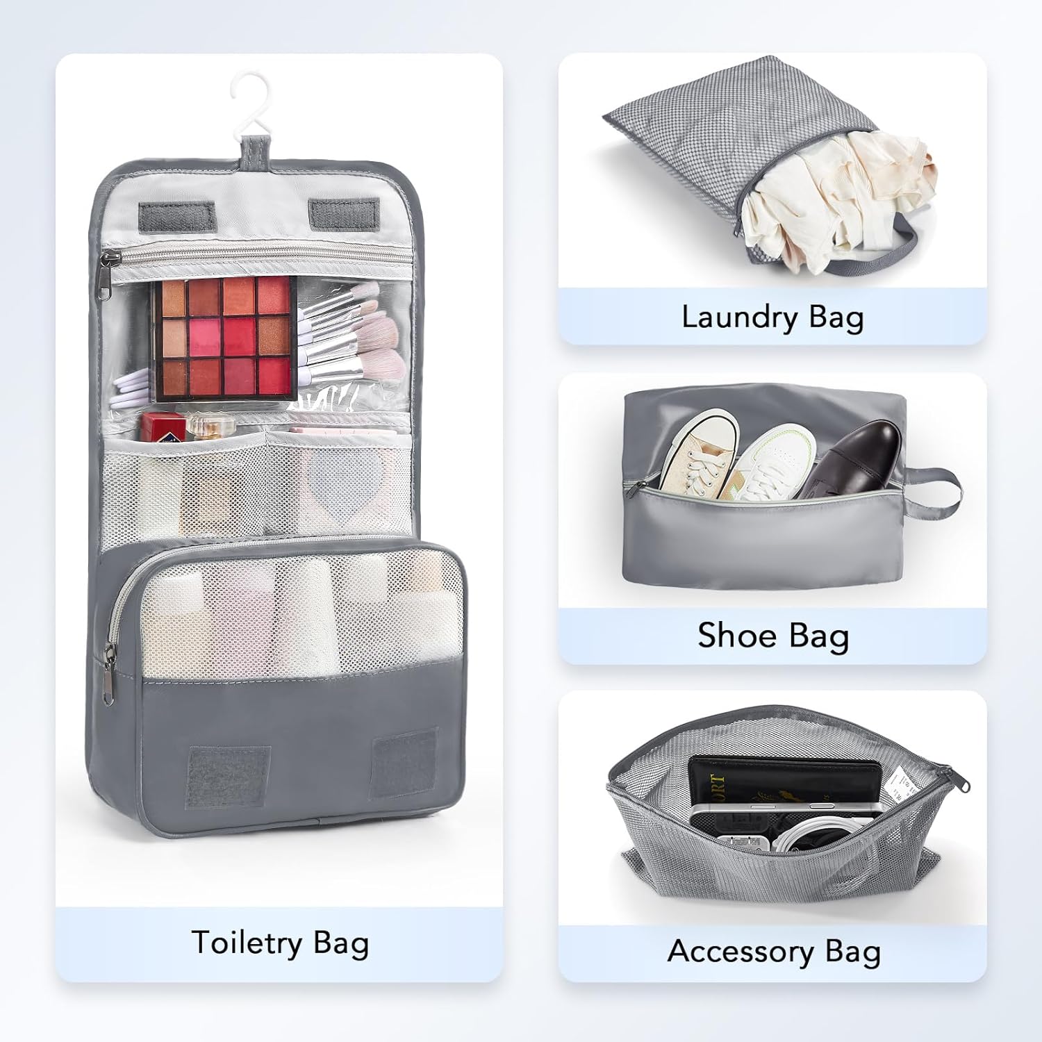 - Ultralight Travel Companion - Engineered for 1-5 Day Getaways! This comprehensive set includes four compression packing cubes in varying sizes (XL, L, M, S) to accommodate everything from bulky coats to delicate tops. Plus, enjoy added convenience with a hanging toiletry bag, shoe bag, machine-washable laundry bag, and versatile pouch—all designed to keep your luggage perfectly organized and clutter-free.