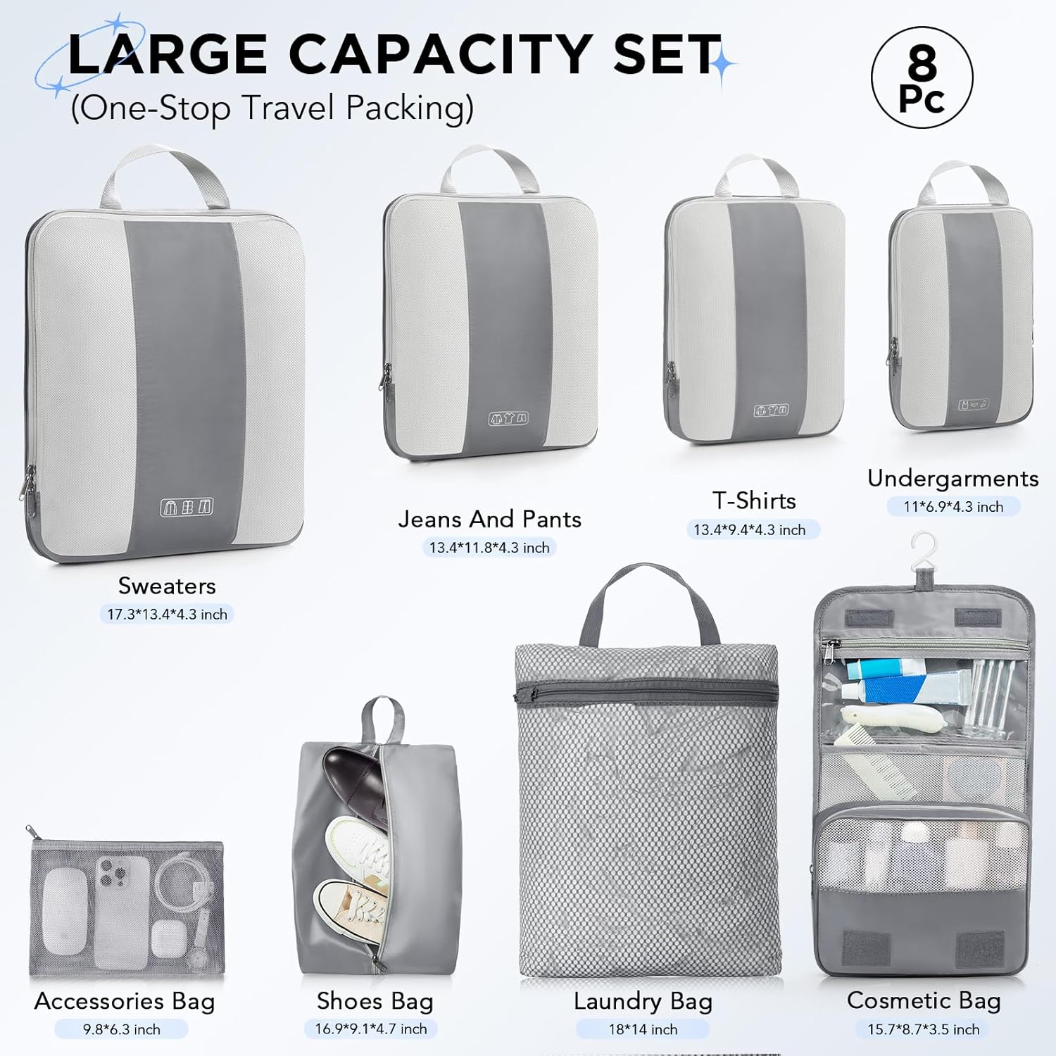- Ready for Any Adventure - Whether you’re heading out for a weekend getaway, a business conference, or a mid-length travel, this High-Capacity 8-Piece Compression Set perfectly fits 20-28-inch suitcases, effortlessly handling all travel scenarios. We’re here to ensure you travel smarter, pack better, and enjoy every moment of your journey with peace of mind.