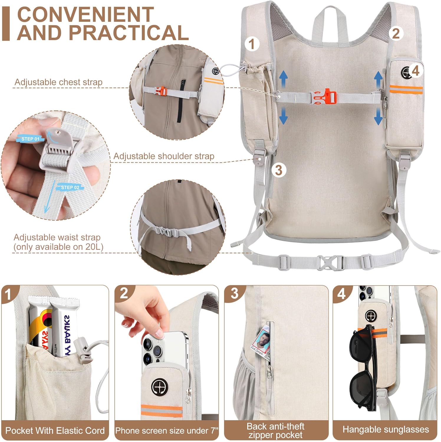 - Organized Multi-Pocket Design: With a capacity of 20L, this lightweight backpack for travel features several compartments, including a front elastic mesh pocket, a front zippered pocket, 2 water bottle holder, and a rear anti-theft zippered pocket, keeping your essentials organized and accessible.